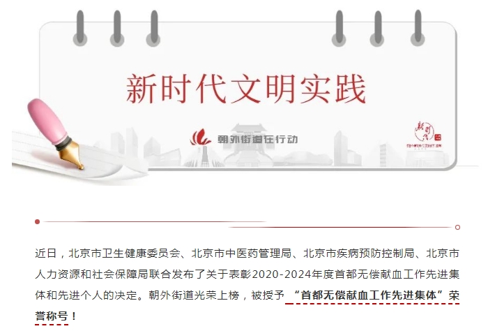 喜报!朝外街道荣获“首都无偿献血工作先进集体”称号!