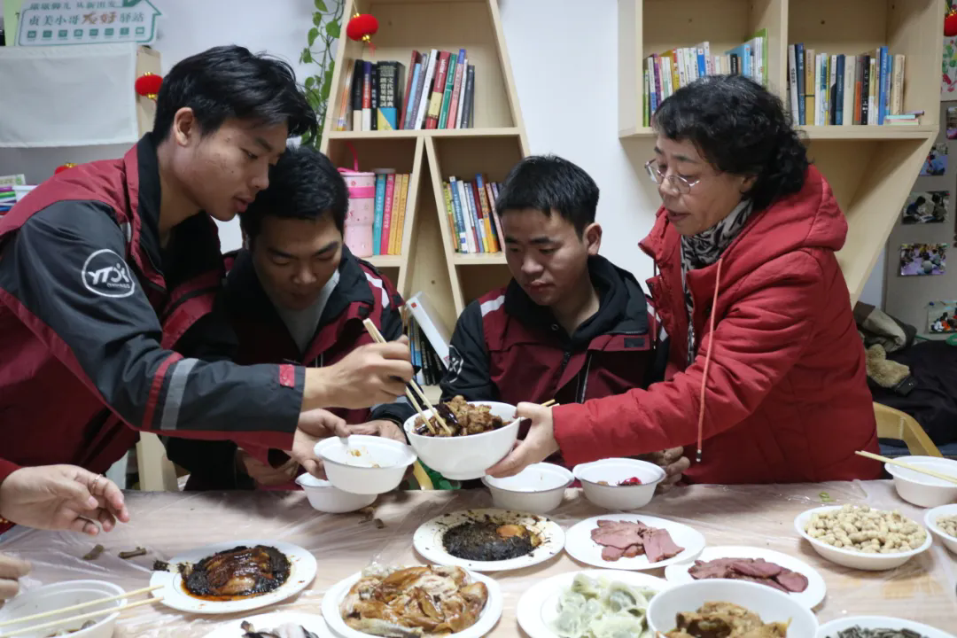 随着白胖的饺子在沸水里翻滚升腾,外卖骑手们也陆续推门进来,卸下一身疲惫与寒气,铺面而来的却是满屋暖意,大家围坐一堂,品尝热气腾腾的饺子和“妈妈味道”的热菜,鲜香美味、暖意十足。