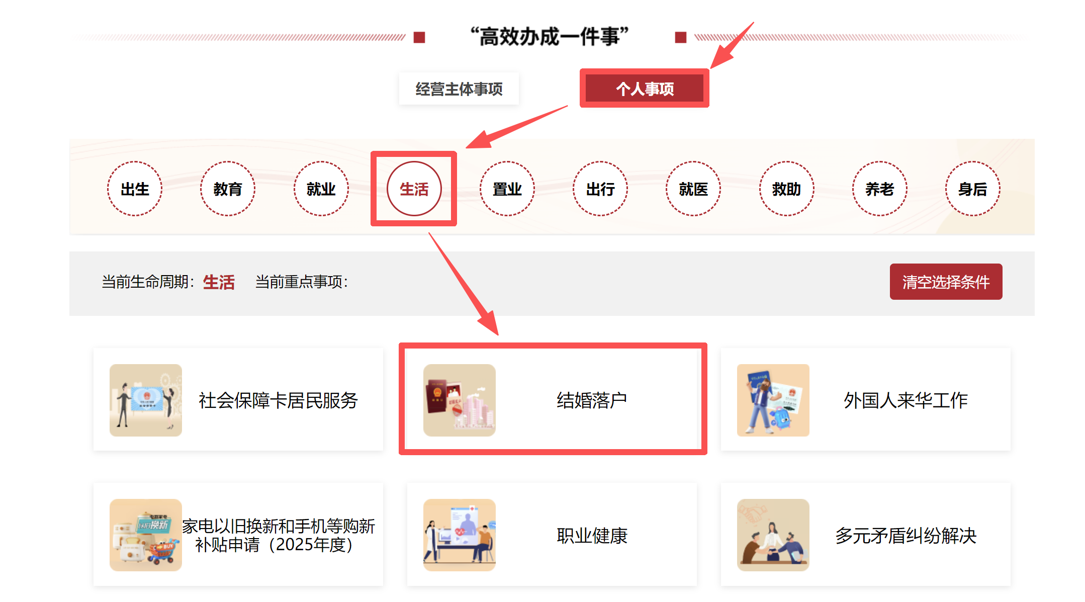 2. 在“一件事”集成服务场景专区内,点击“个人事项”场景,点击“生活”,点击“结婚落户”;