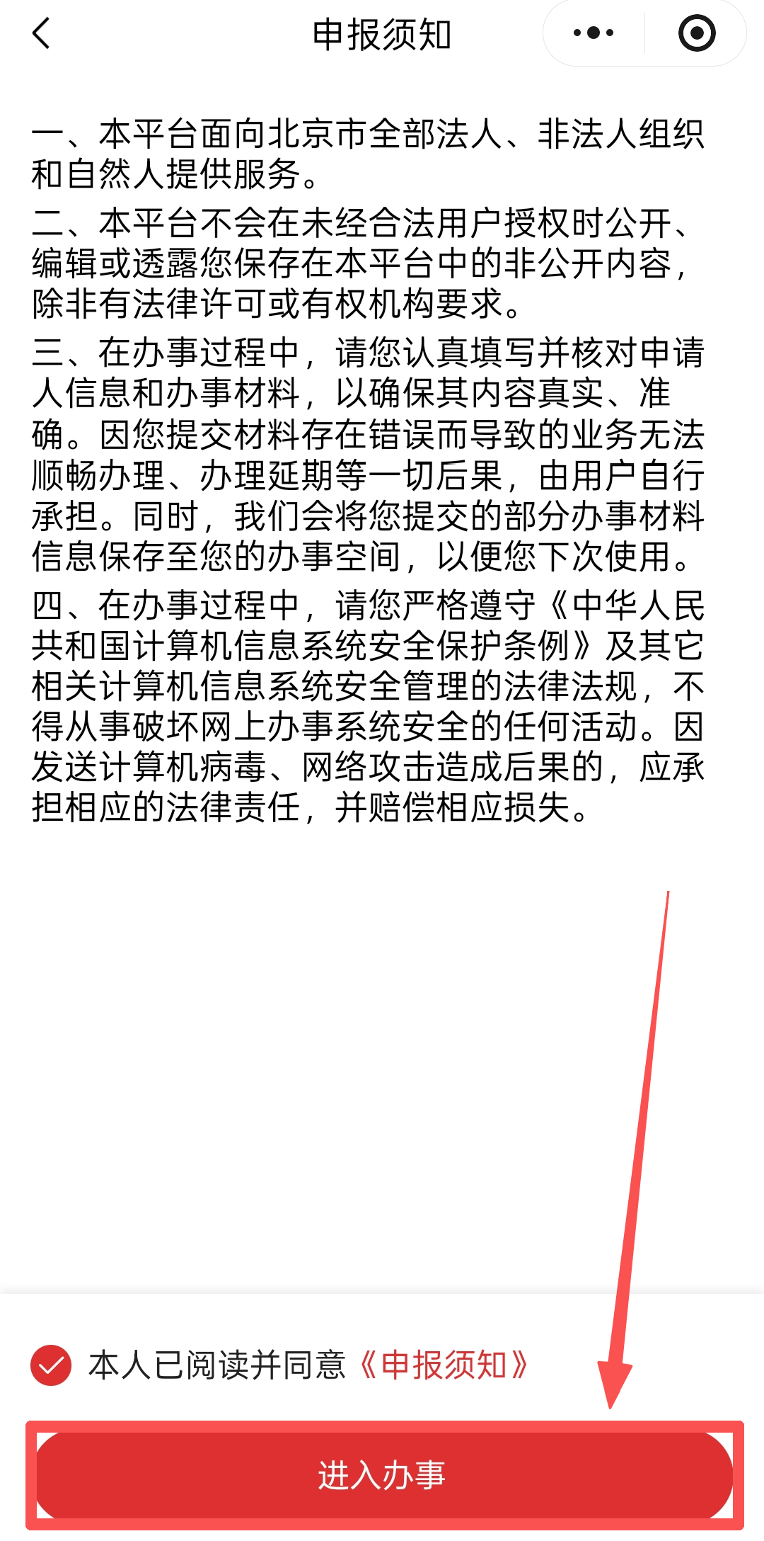 4. 认真阅读“申报须知”内容,点击“进入办事”;