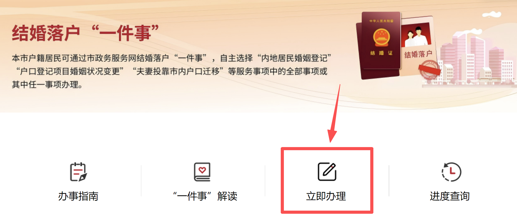 结婚落户“一件事”是“高效办成一件事”改革中聚焦民生刚需的重要服务举措,本市户籍居民可通过“北京市政务服务网”结婚落户“一件事”入口,自主选择“内地居民婚姻登记”、“户口登记项目婚姻状况变更”、“夫妻投靠市内户口迁移”等服务事项中的全部事项或其中任一事项办理,优化办事流程、减少跑动次数、跨部门联动提速,让每对夫妻开启新生活更轻松。接下来带您看一下办理流程吧~