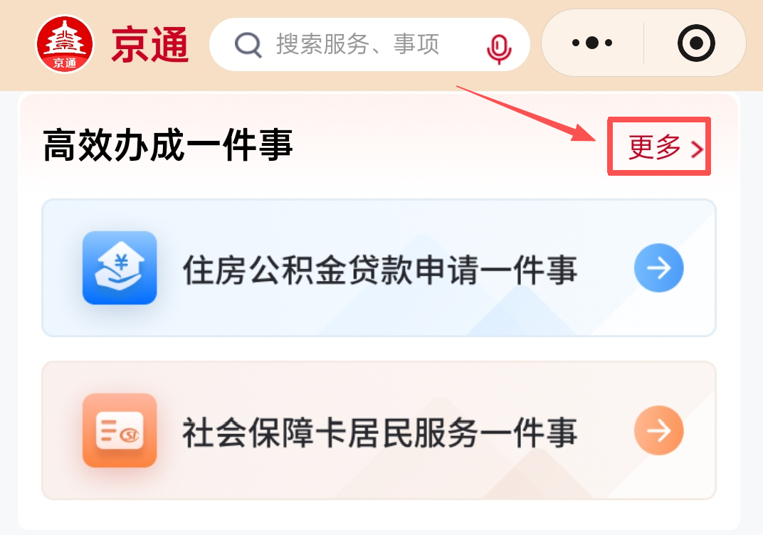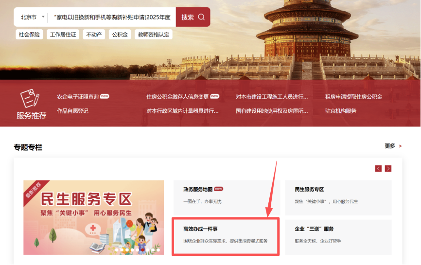 1. 登录“北京市政务服务网”(https://banshi.beijing.gov.cn/),在“专题专栏”中,点击“高效办成一件事”;