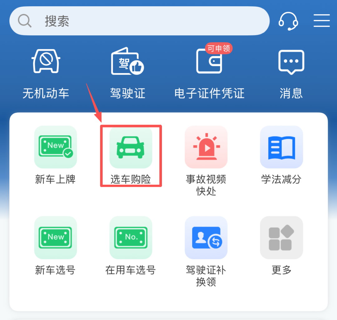 未购车购险的,点击“选车购险”模块在线选车即可;已购车购险的,直接点击“新车上牌”模块