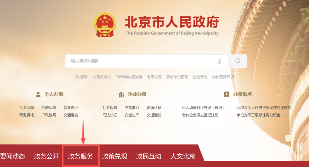 1. 登录“北京市政务服务网”(https://banshi.beijing.gov.cn/),点击“政务服务”;