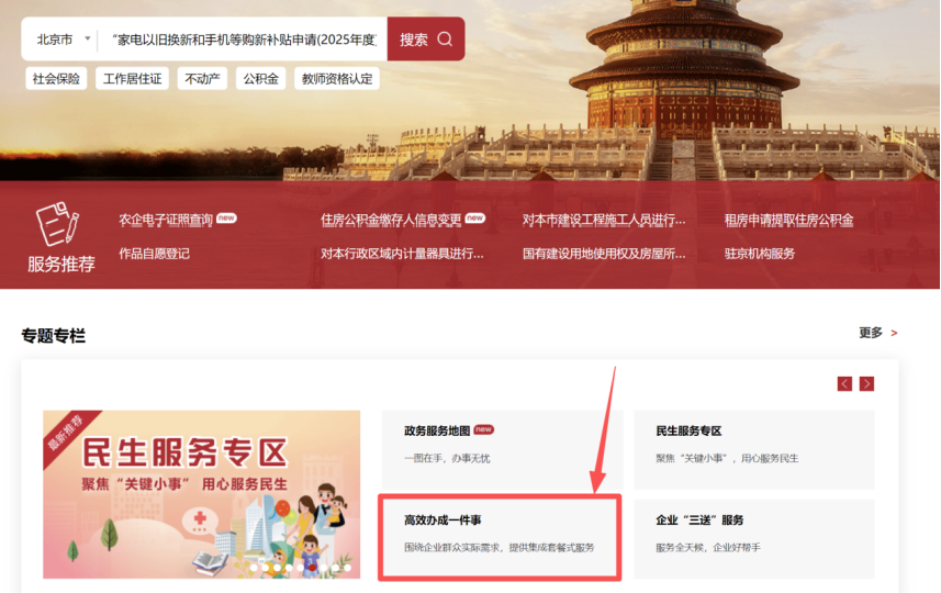 1. 登录“北京市政务服务网”(https://banshi.beijing.gov.cn/),在“专题专栏”中,点击“高效办成一件事”;