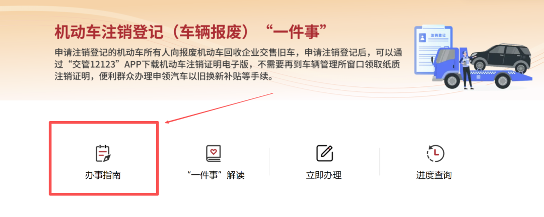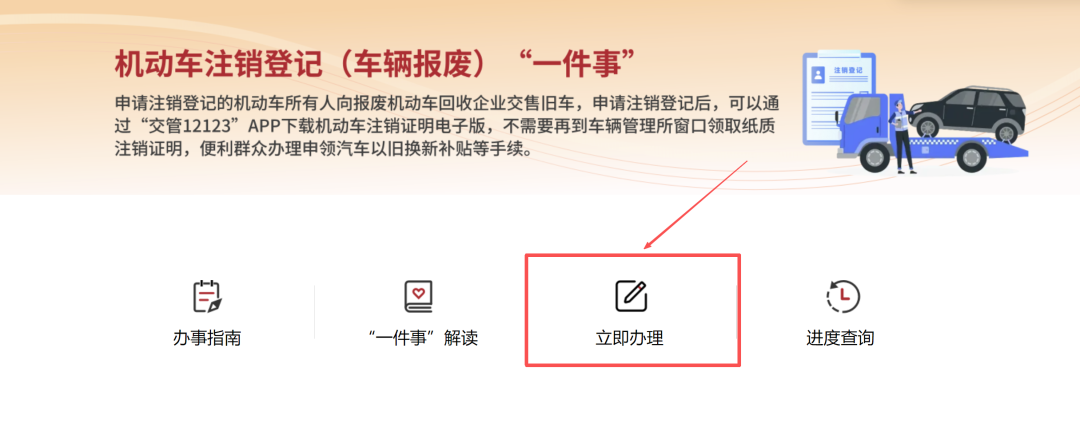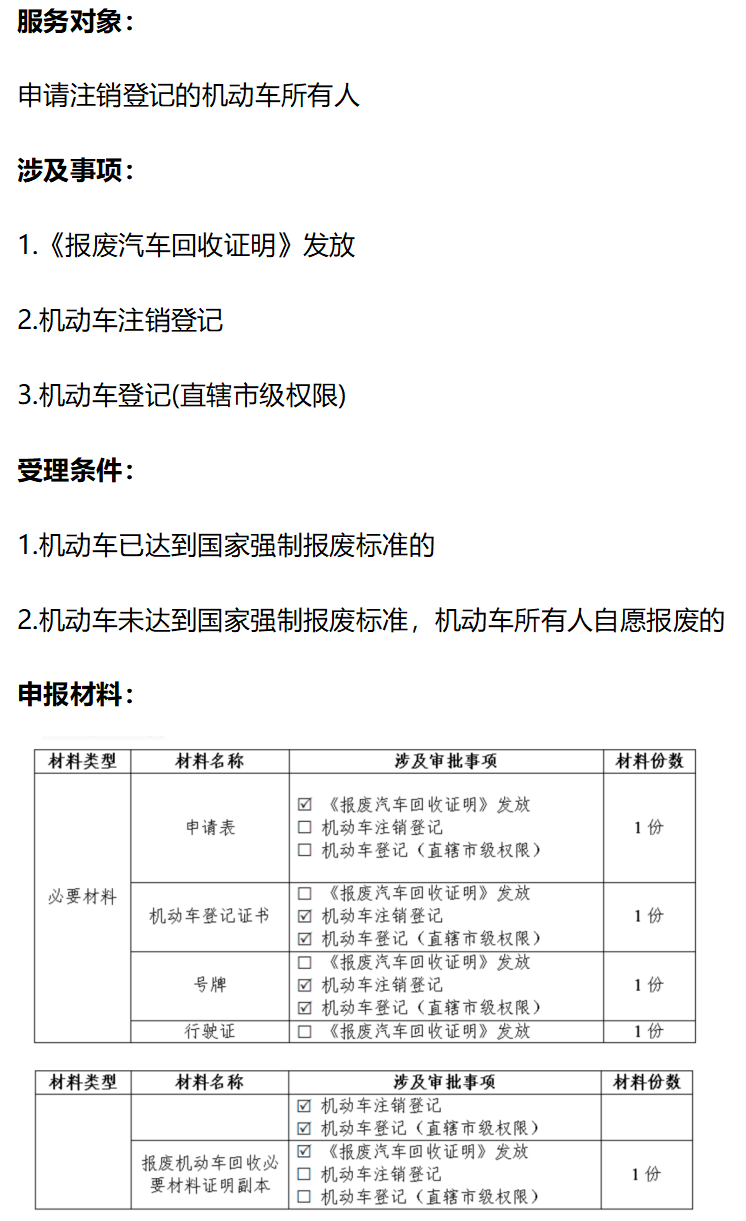 机动车注销登记(车辆报废)“一件事”,申请注销登记的机动车所有人向报废机动车回收企业交售旧车,申请注销登记后,可以通过“交管12123”APP下载机动车注销证明电子版,不需要再到车辆管理所窗口领取纸质注销证明,让您办理申领汽车以旧换新补贴等手续更便利。