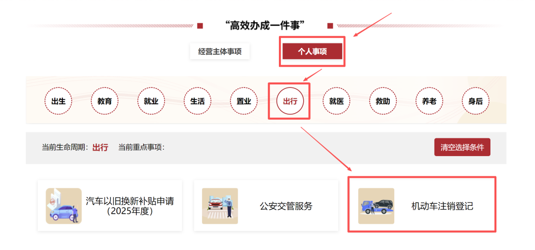 2.在“一件事”集成服务场景专区内,点击“个人事项”场景,点击“出行”,点击“机动车注销登记”;