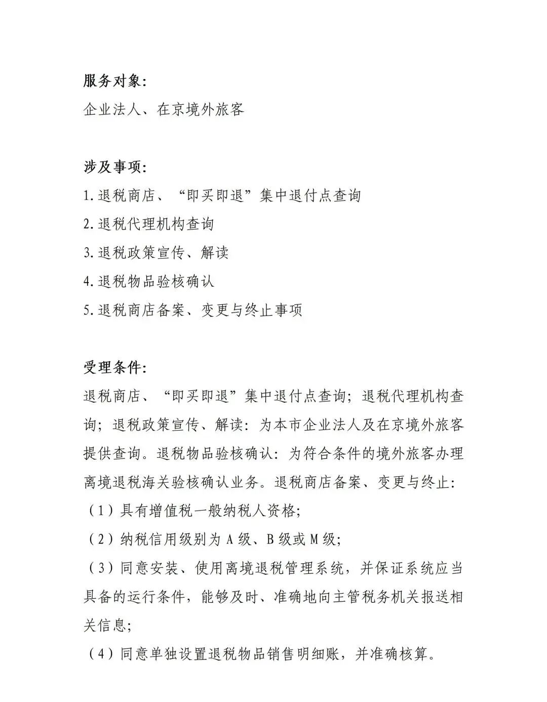 境外旅客购物离境退税“一件事”(试运行),为符合条件的法人企业及境外旅客提供购物离境退税(退税商店、“即买即退”集中退付点查询、退税代理机构查询、退税政策宣传、解读、退税物品验核确认、退税商店备案、变更与终止事项)“一件事”办理服务。