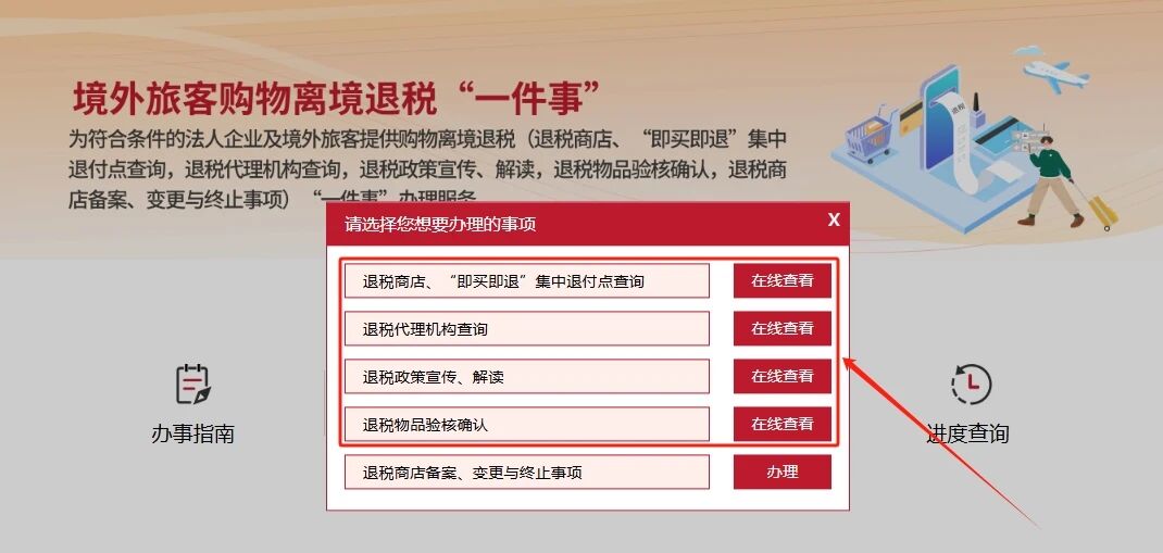 4.点击“立即办理”,可在线查看:退税商店、“即买即退”集中退付点查询;退税代理机构查询;退税政策宣传、解读;退税物品验核确认;