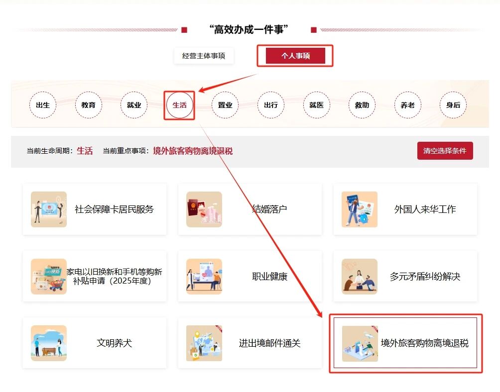 2.进入“高效办成一件事”专区后,点击“个人事项”→“生活”→“境外旅客购物离境退税”。