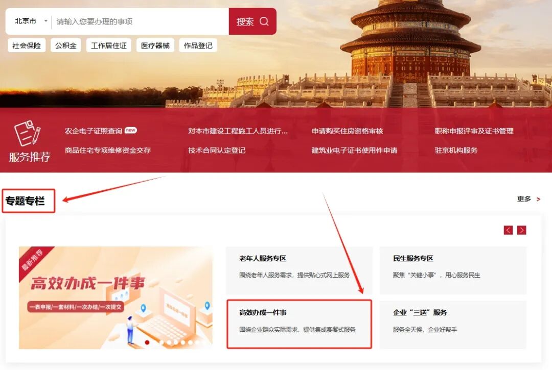 1.登录“北京市政务服务网”(https://banshi.beijing.gov.cn/),在“专题专栏”中,点击“高效办成一件事”;