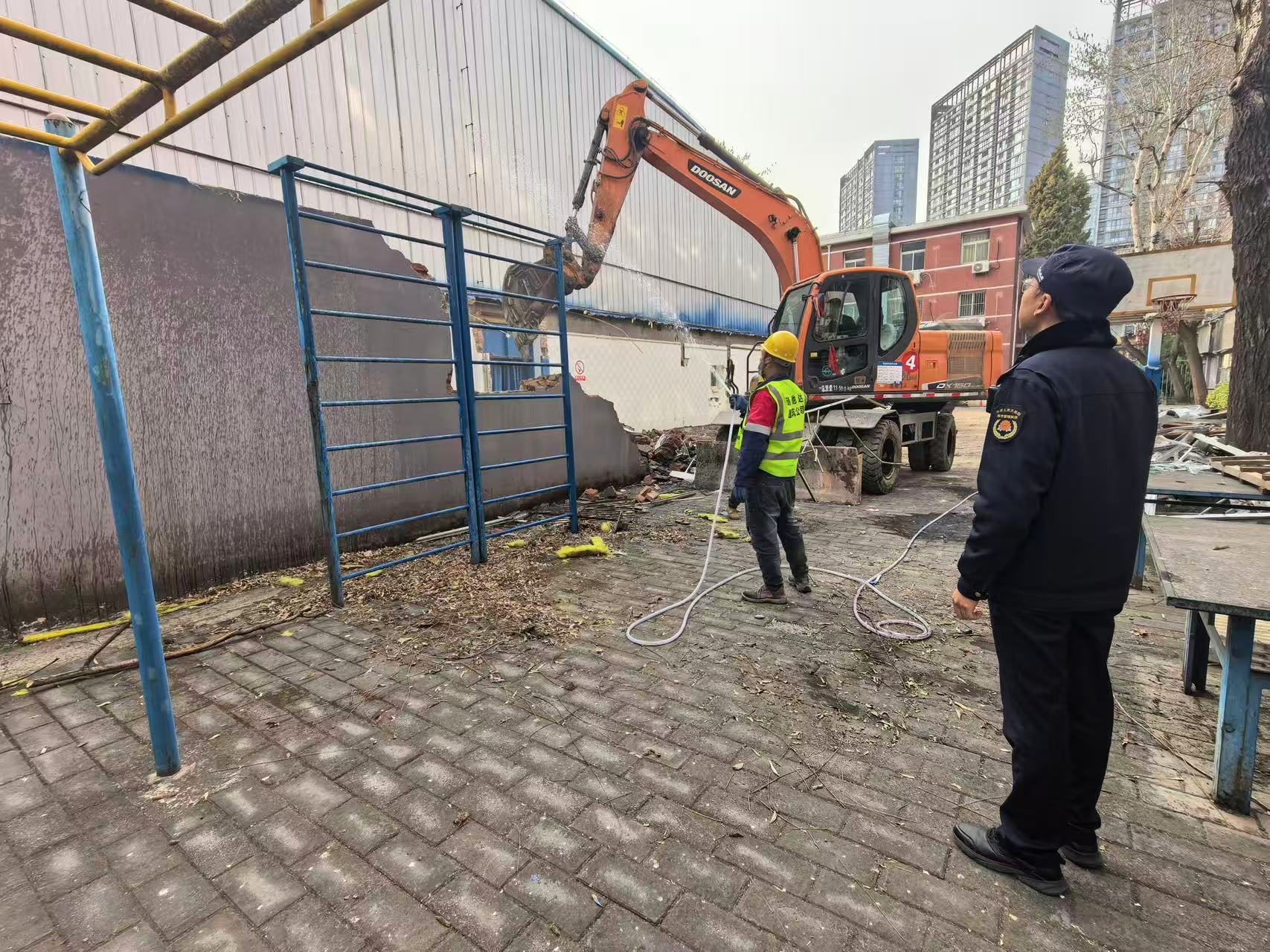 3月19日,左家庄执法队对校园内违法建设进行拆除。(通讯员 左家庄 姜帆)