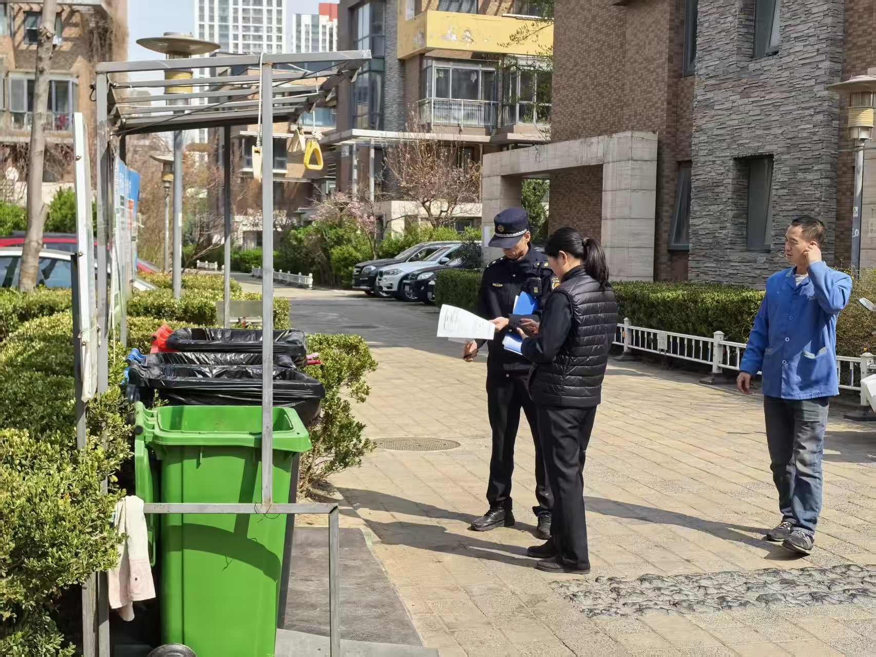 3月31日,奥运村执法队对辖区内小区垃圾分类情况进行检查。(通讯员 奥运村 龚丽丽)