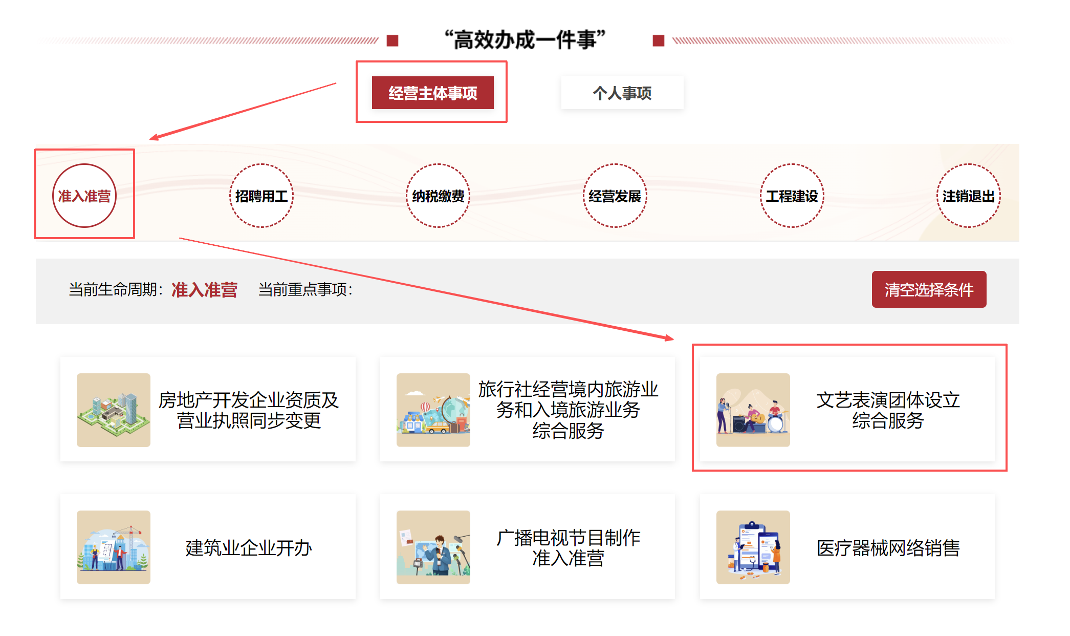 2.进入“高效办成一件事”专区后,点击“经营主体事项”→“准入准营”→“文艺表演团体设立综合服务”;
