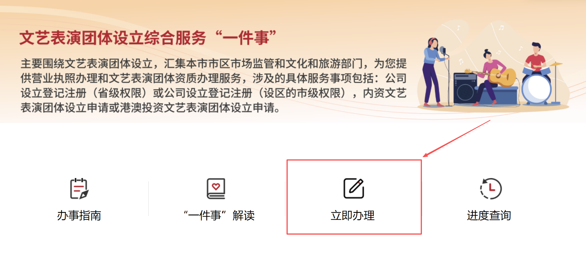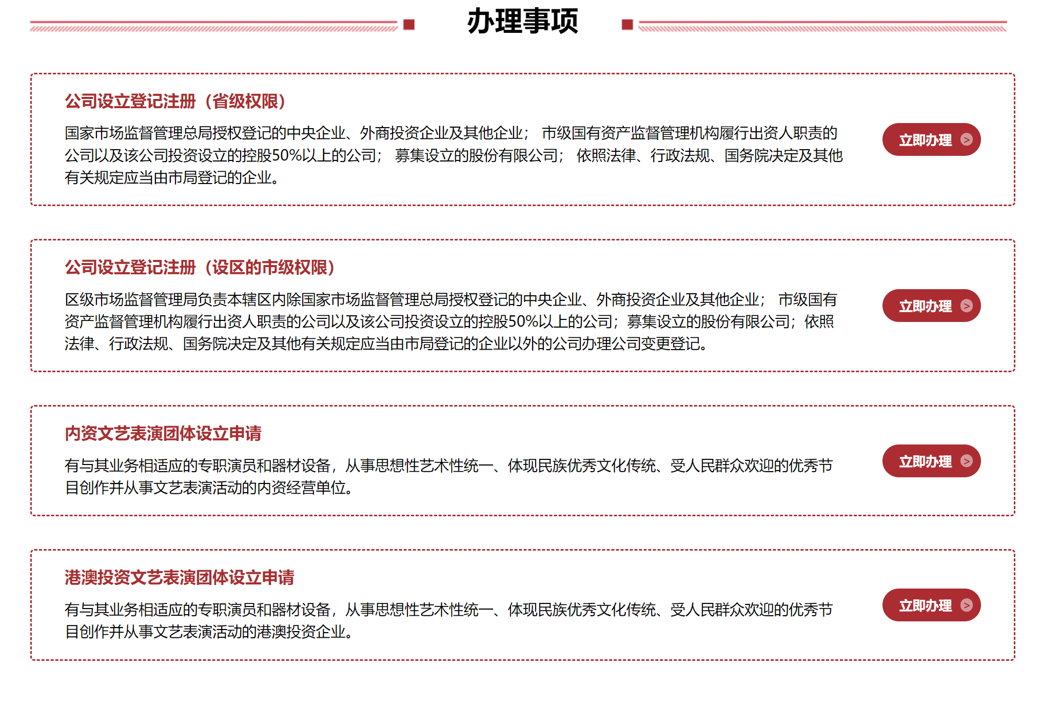 5.您可在公司设立登记注册(省级权限)、公司设立登记注册(设区的市级权限)、内资文艺表演团体设立申请、港澳投资文艺表演团体设立申请中选择要办理的业务,点击立即办理;