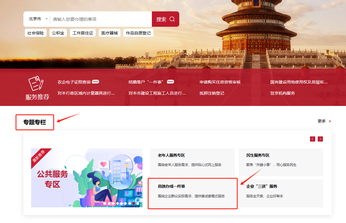 1.登录【北京市政务服务网】(https://banshi.beijing.gov.cn/),在“专题专栏”中,点击“高效办成一件事”;