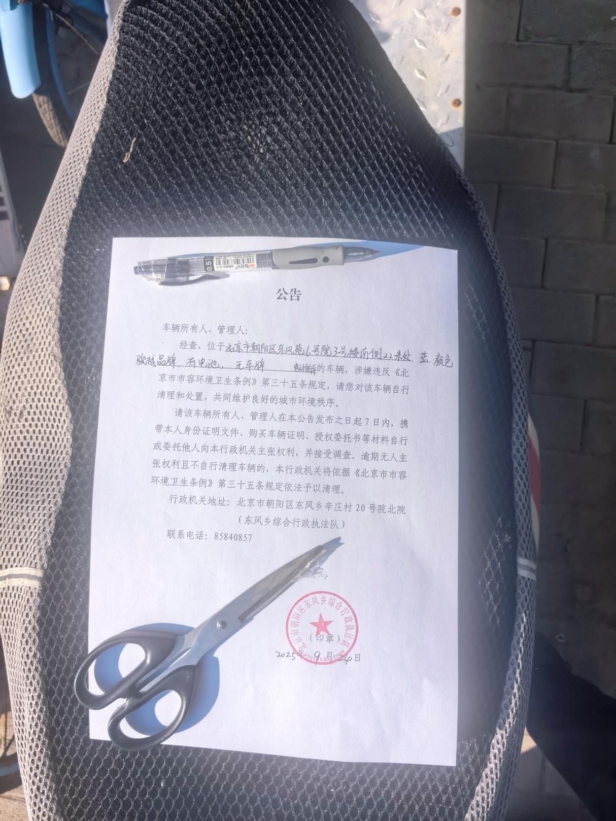 经查,位于北京市朝阳区东风乡东风苑6号院3号楼南侧22米处的壹辆蓝色、骏越品牌,有电池,无车牌的电动自行车,涉嫌违反《北京市市容环境卫生条例》第三十五条规定,请您对该车辆自行清理和处置,共同维护良好的城市环境秩序。