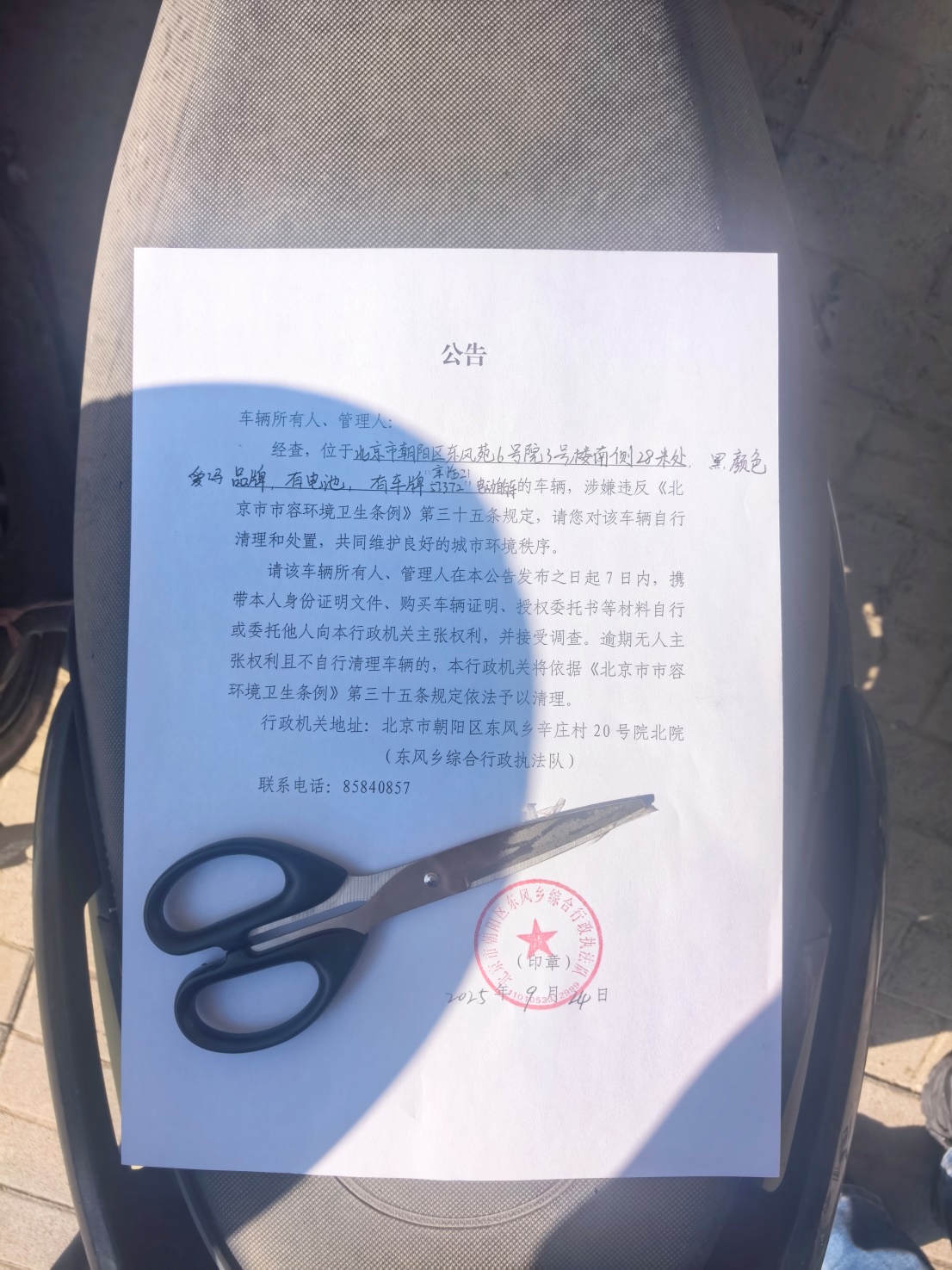 经查,位于北京市朝阳区东风乡东风苑6号院3号楼南侧28米处的壹辆黑色、爱玛品牌,有电池,有车牌“京临2157372”的电动自行车,涉嫌违反《北京市市容环境卫生条例》第三十五条规定,请您对该车辆自行清理和处置,共同维护良好的城市环境秩序。