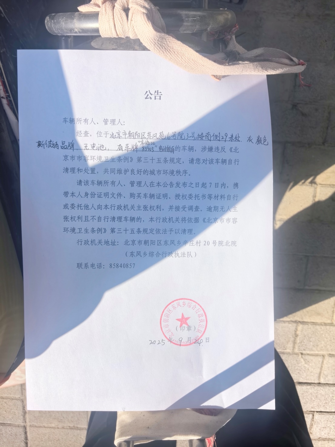 经查,位于北京市朝阳区东风乡东风苑6号院3号楼南侧29米处的壹辆灰色、斯彼特品牌,无电池,有车牌“京临2285905”的电动自行车,涉嫌违反《北京市市容环境卫生条例》第三十五条规定,请您对该车辆自行清理和处置,共同维护良好的城市环境秩序。