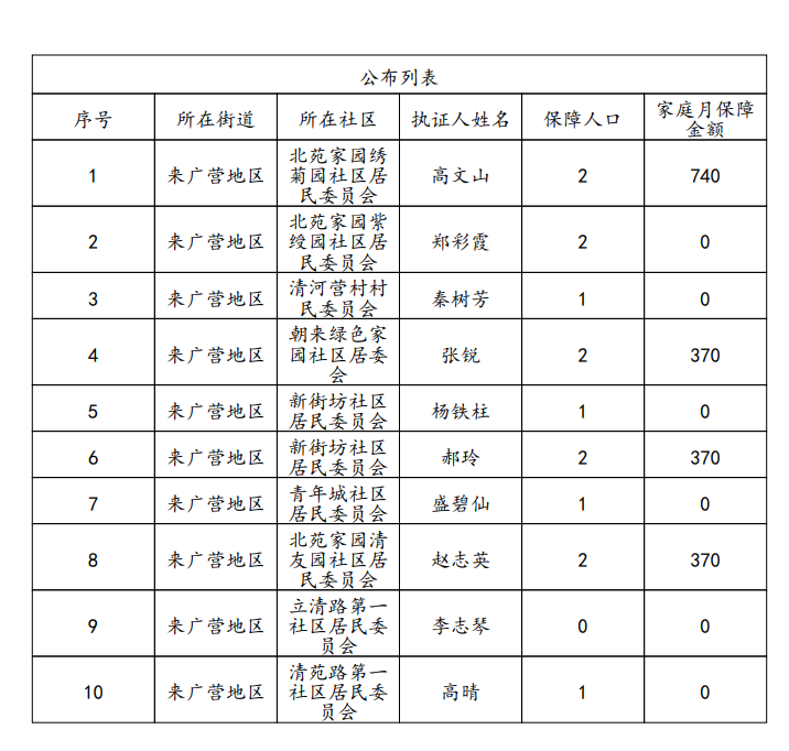 来广营地区2025年11月享受城乡低收入公布