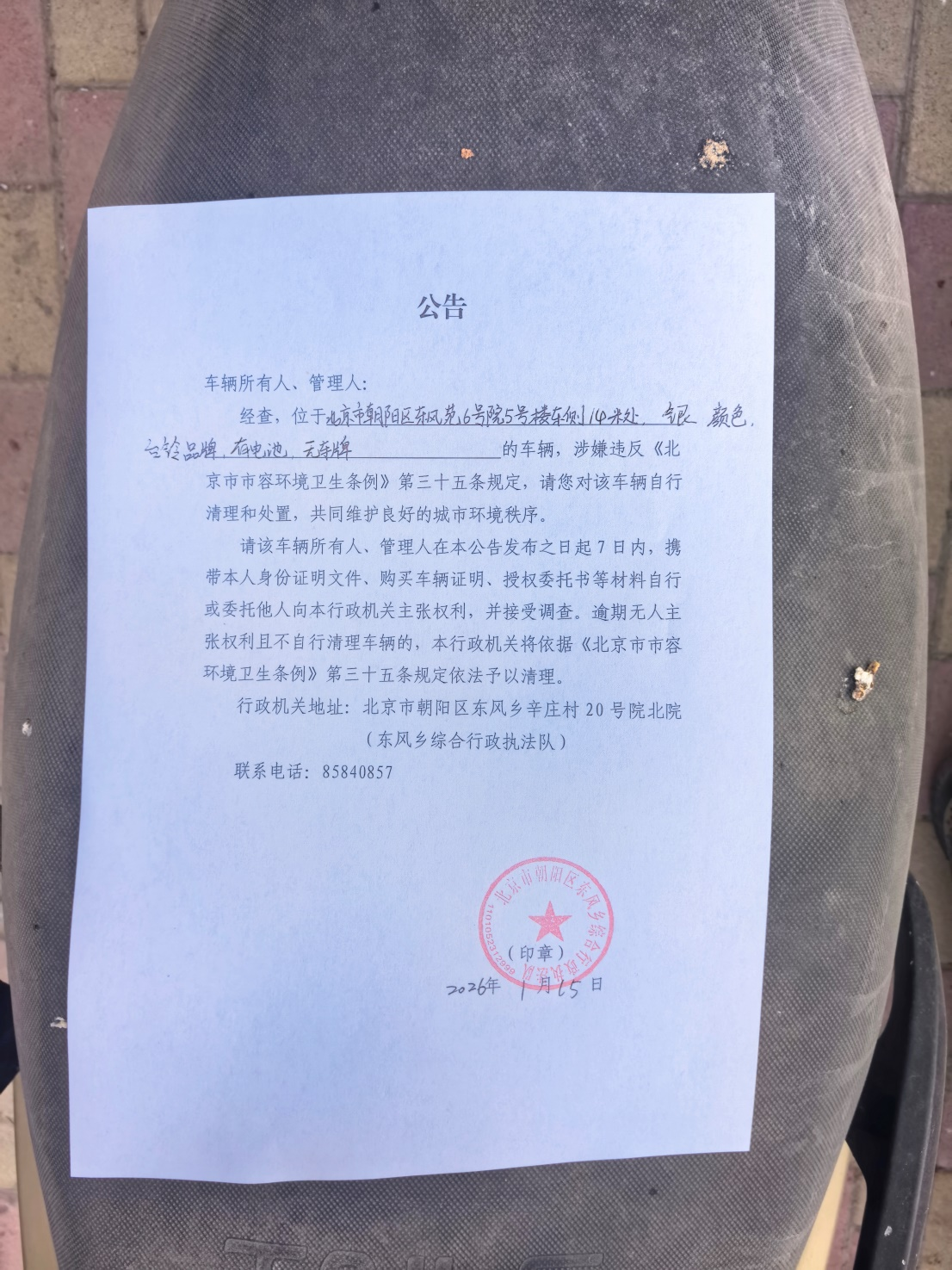 请该车辆所有人、管理人在本公告发布之日起7日内,携带本人身份证明文件、购买车辆证明、授权委托书等材料自行或委托他人向本行政机关主张权利,并接受调查。逾期无人主张权利且不自行清理车辆的,本行政机关将依据《北京市市容环境卫生条例》第三十五条规定依法予以清理。