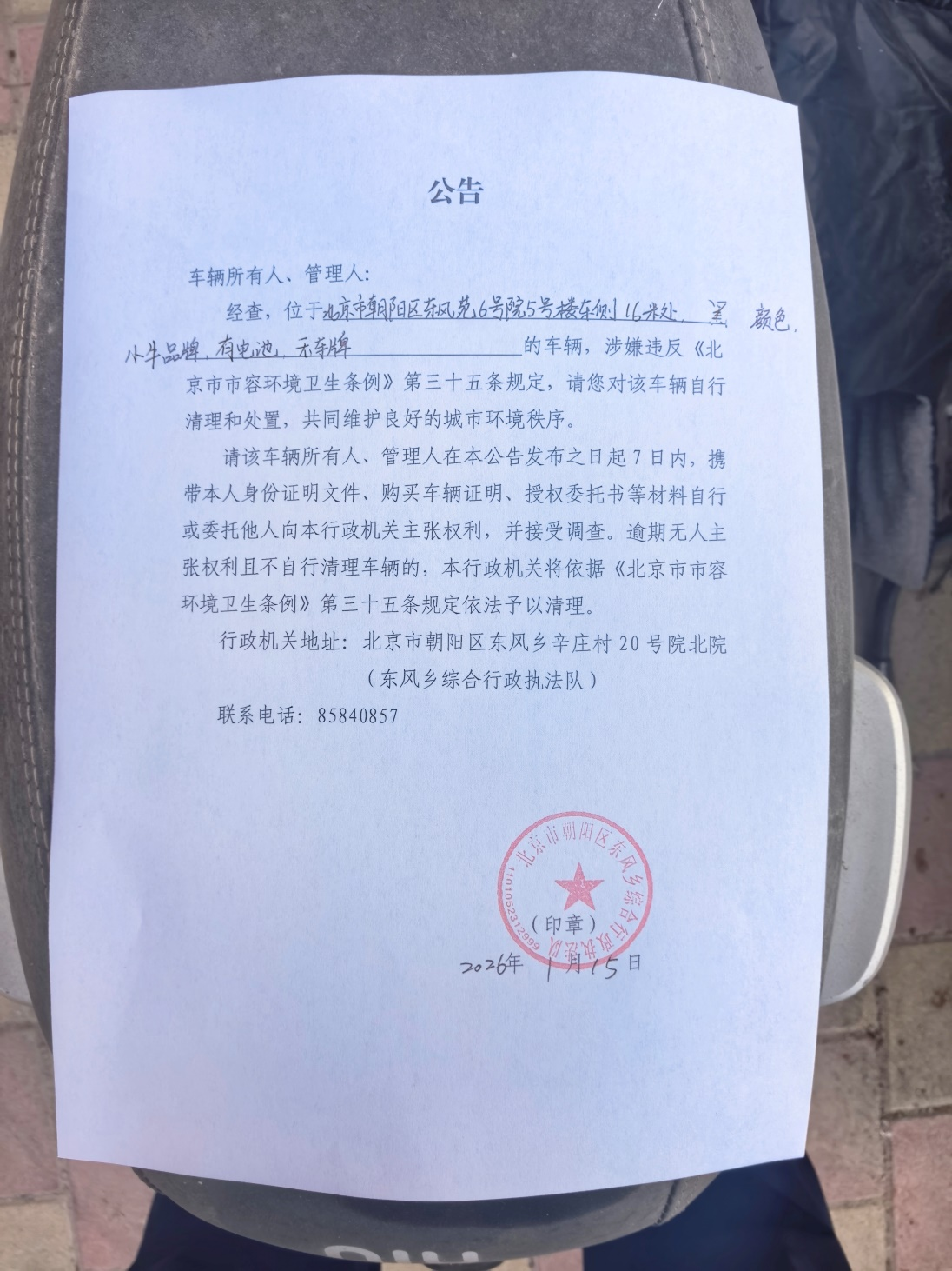 经查,位于北京市朝阳区东风乡东风苑6号院5号楼东侧16米处的壹辆黑色、小牛品牌,有电池,无车牌的电动自行车,涉嫌违反《北京市市容环境卫生条例》第三十五条规定,请您对该车辆自行清理和处置,共同维护良好的城市环境秩序。