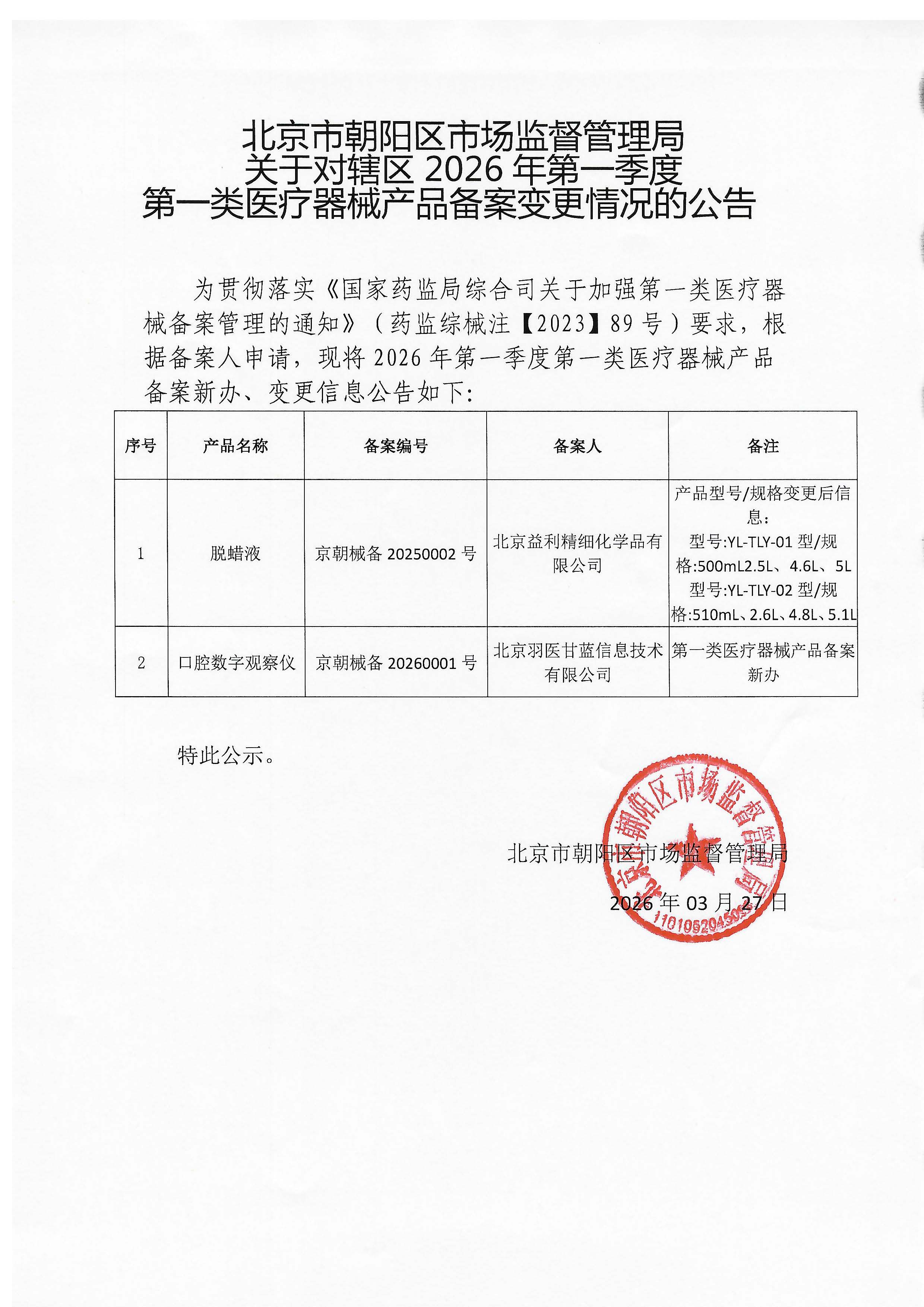 北京市朝阳区市场监督管理局关于对辖区2026年第一季度第一类医疗器械产品备案变更情况的公告