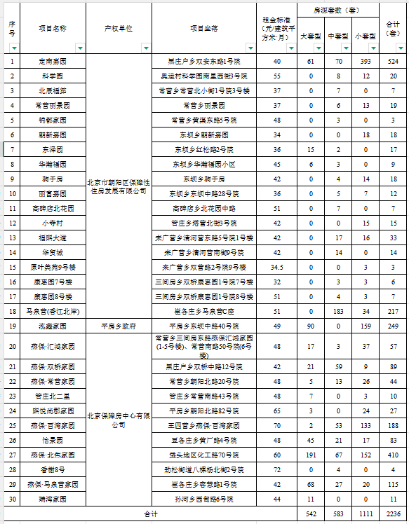 此次配租房源涉及30个公租房项目,房源共计2236套。其中,大套型542套,中套型583套,小套型1111套。