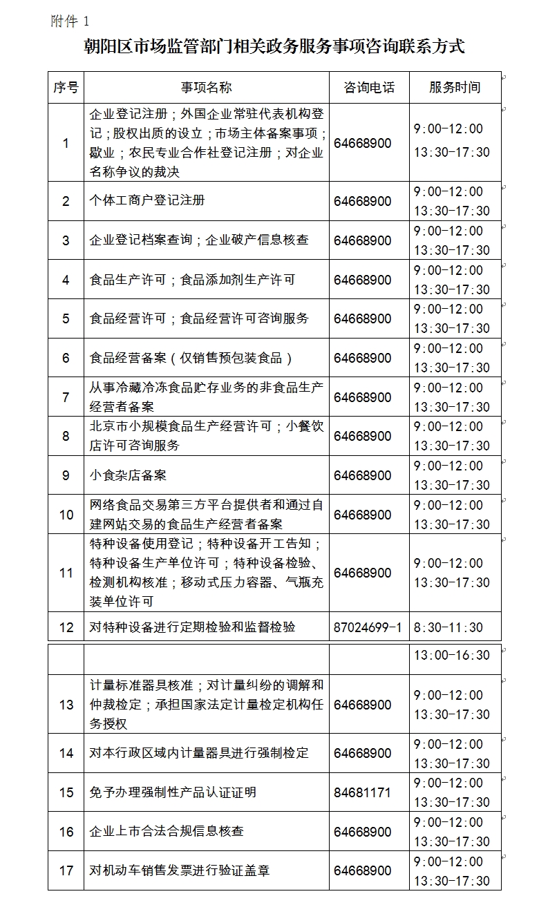 朝阳区市场监管部门相关政务服务事项咨询联系方式