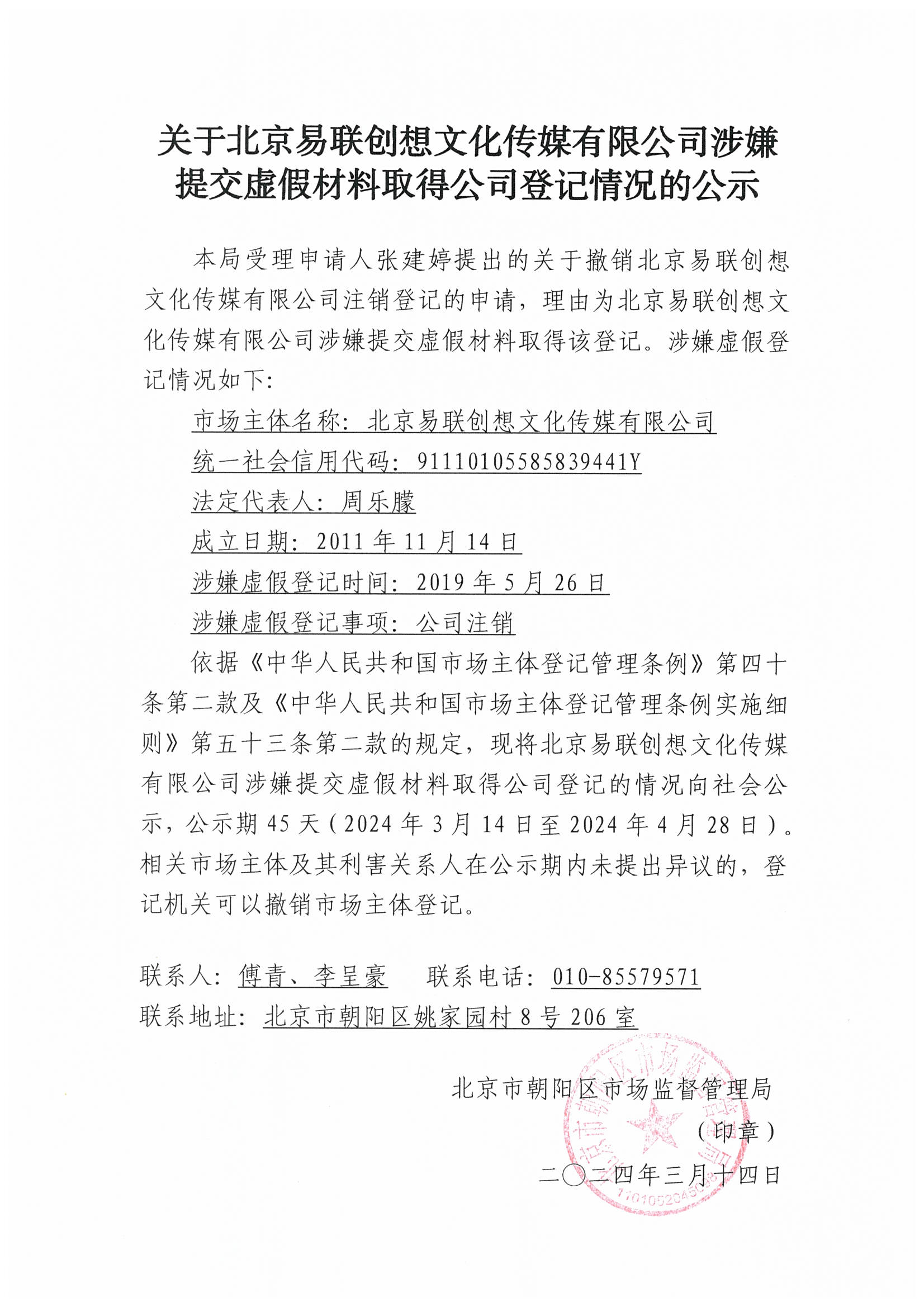 关于北京易联创想文化传媒有限公司涉嫌提交虚假材料取得公司登记情况的公示