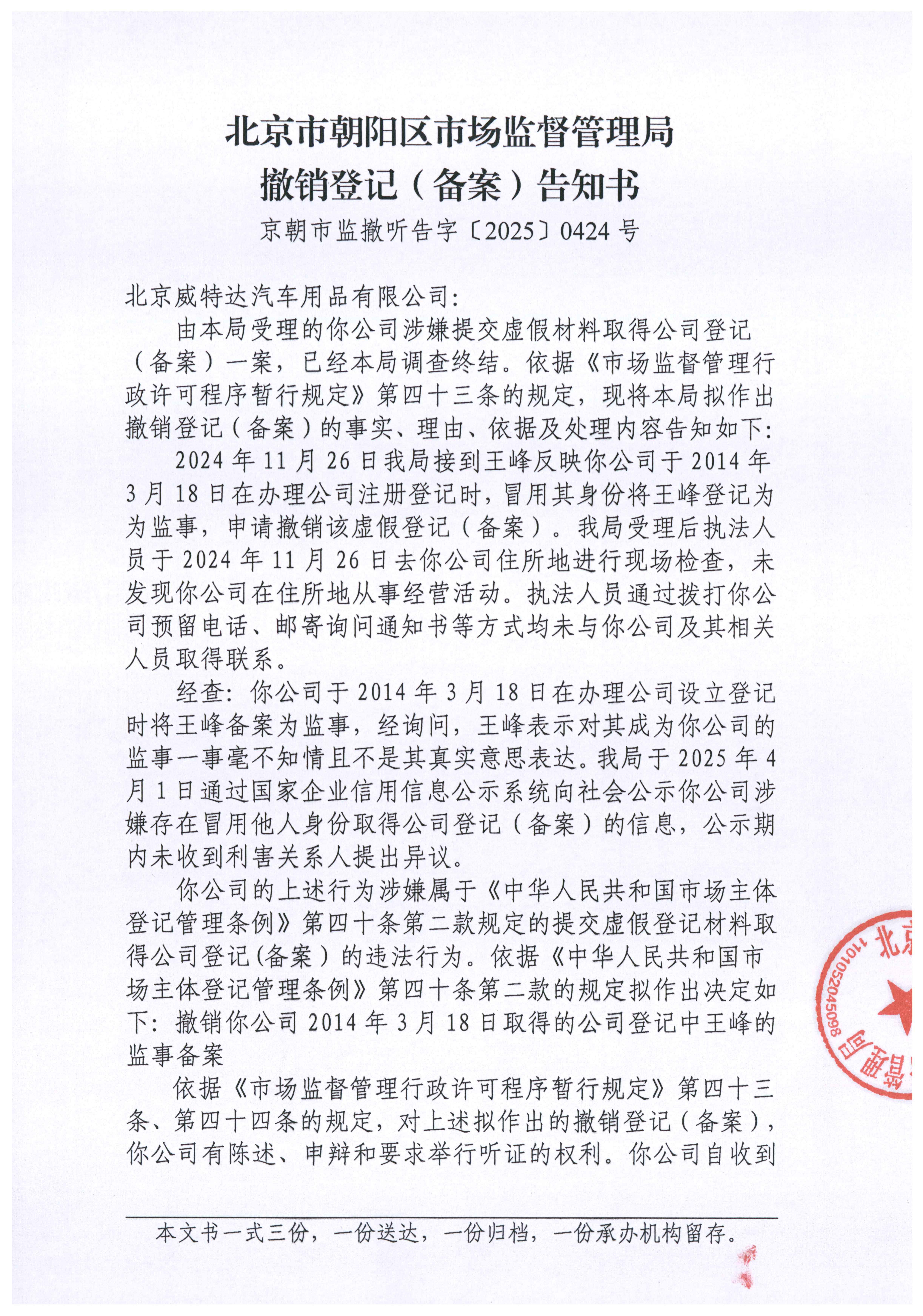 撤销北京威特达汽车用品有限公司登记(备案)告知书