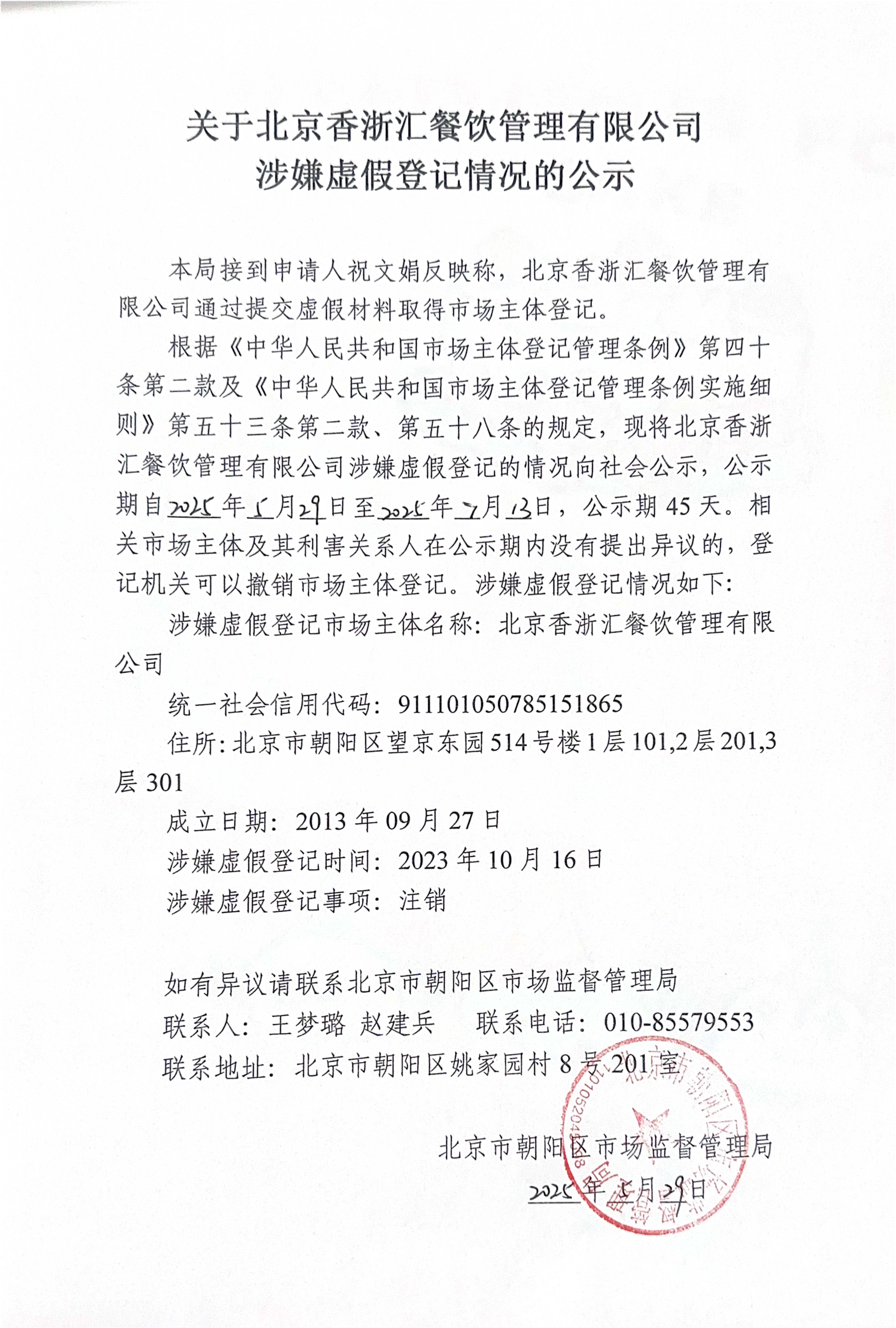 关于北京香浙汇餐饮管理有限公司涉嫌虚假登记情况的公示