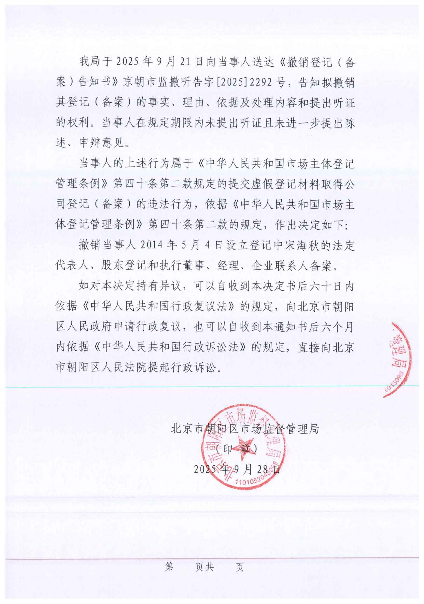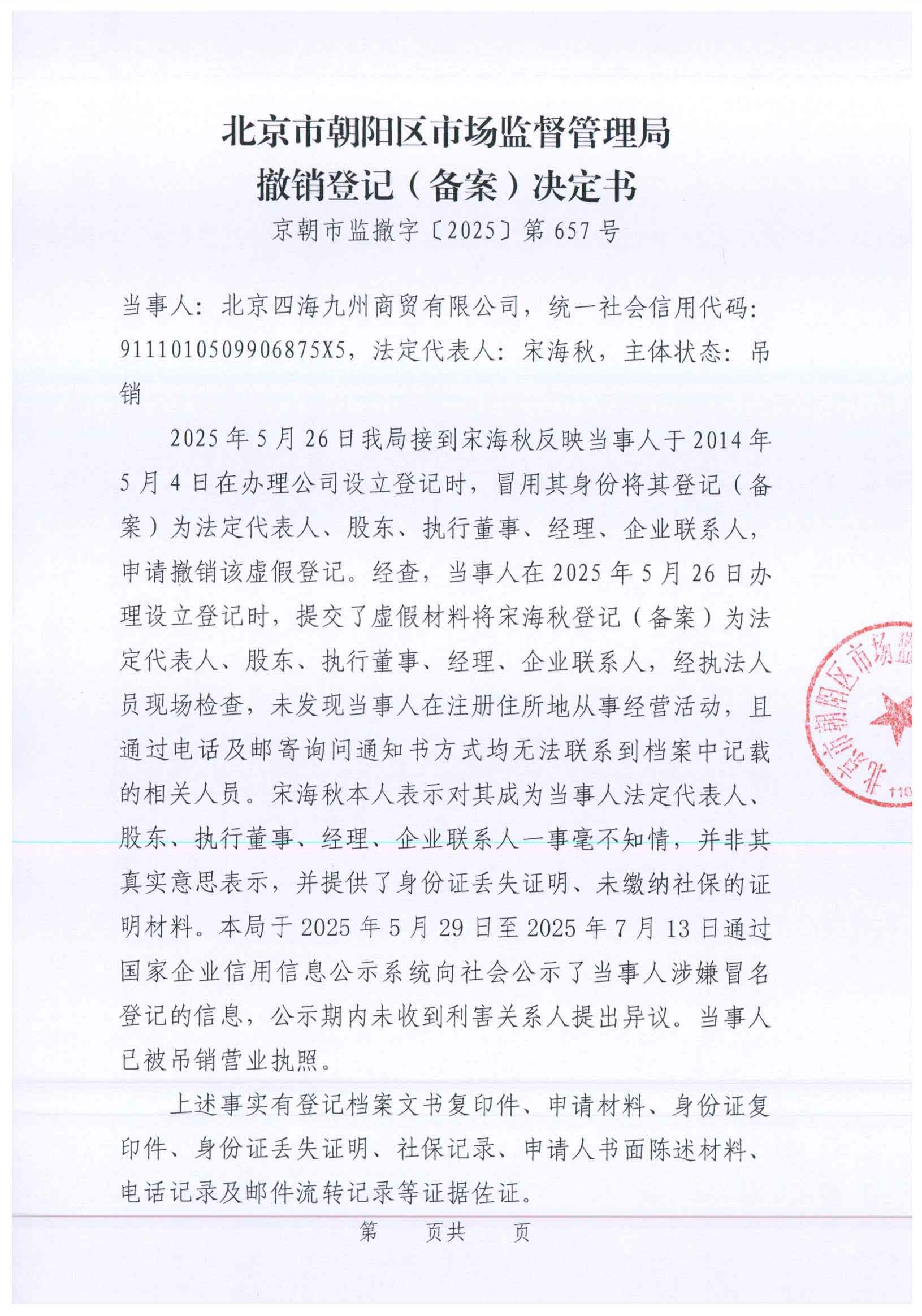 撤销北京四海九州商贸有限公司登记(备案)决定书
