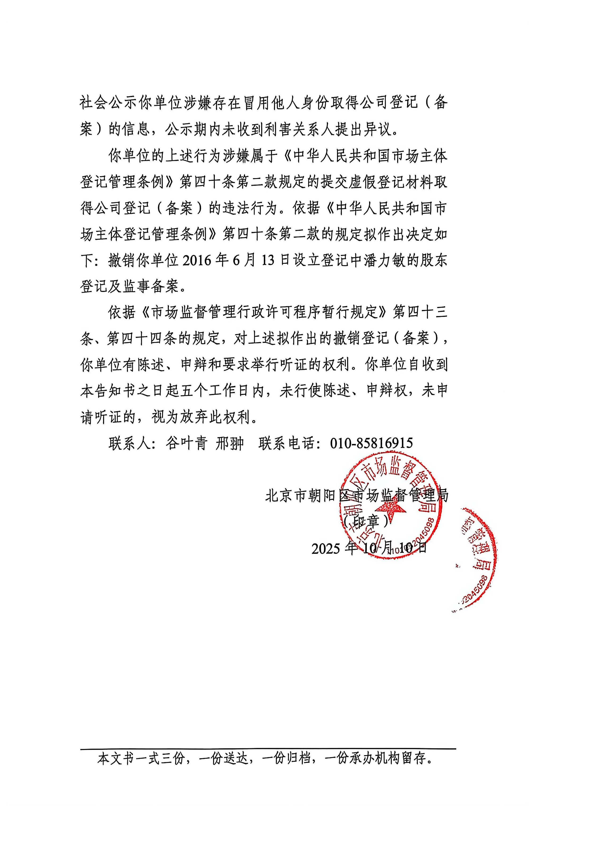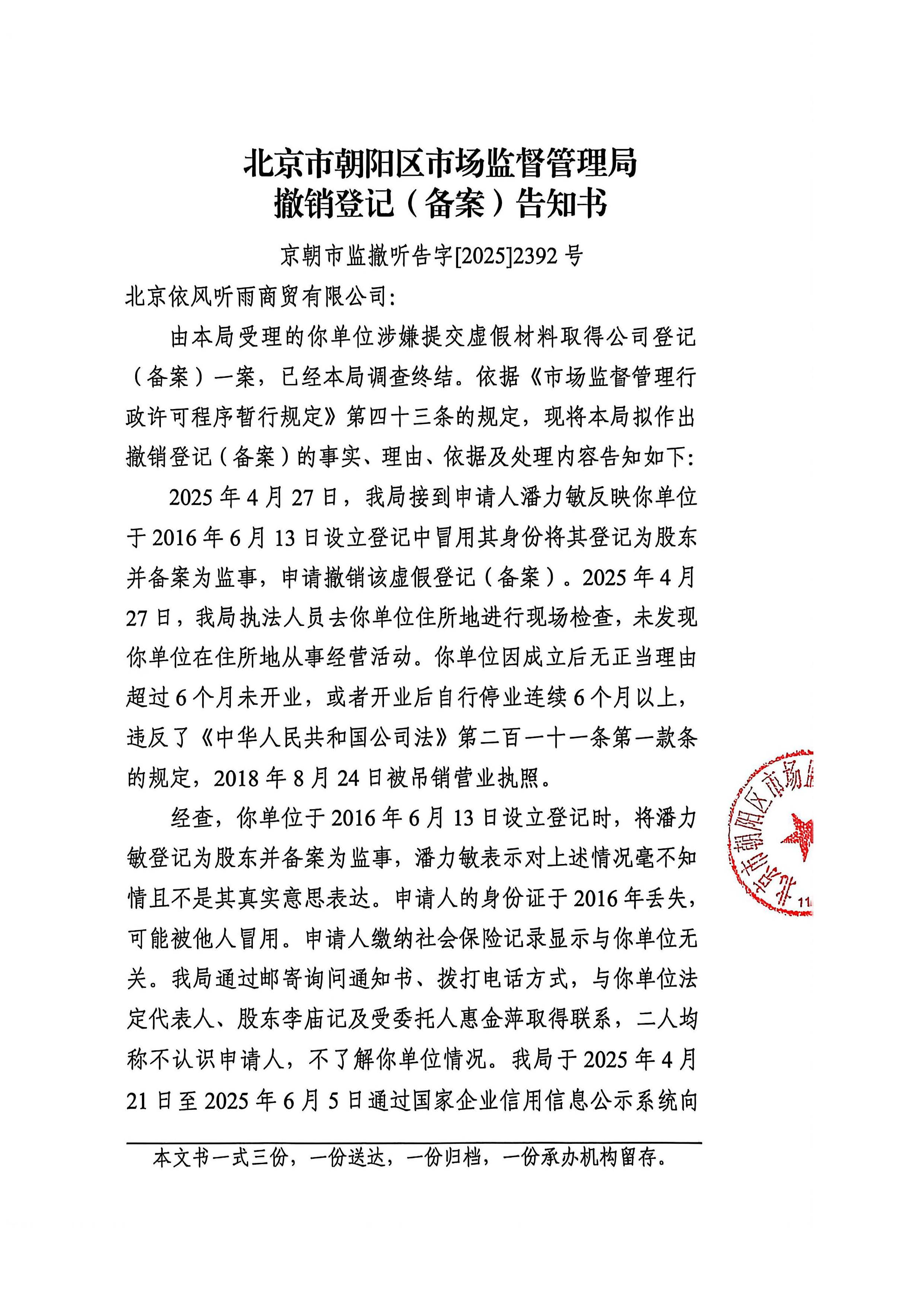 撤销北京依风听雨商贸有限公司登记(备案)告知书
