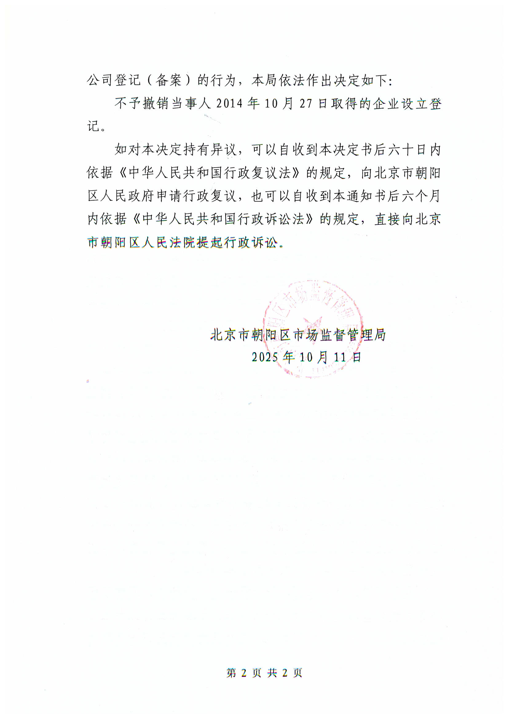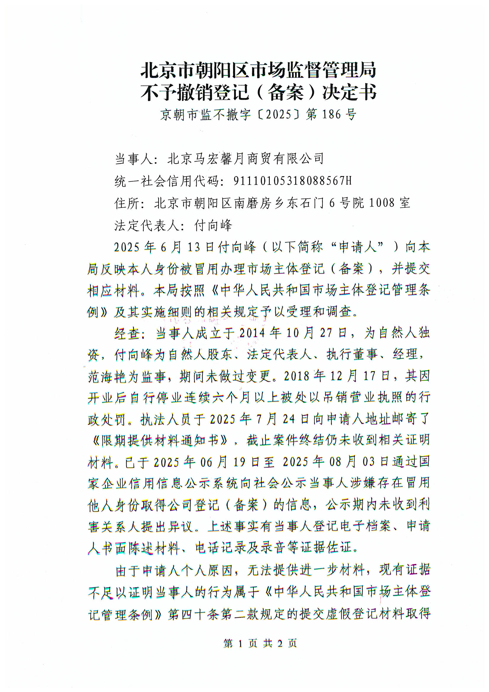 不予撤销北京马宏馨月商贸有限公司登记(备案)决定书
