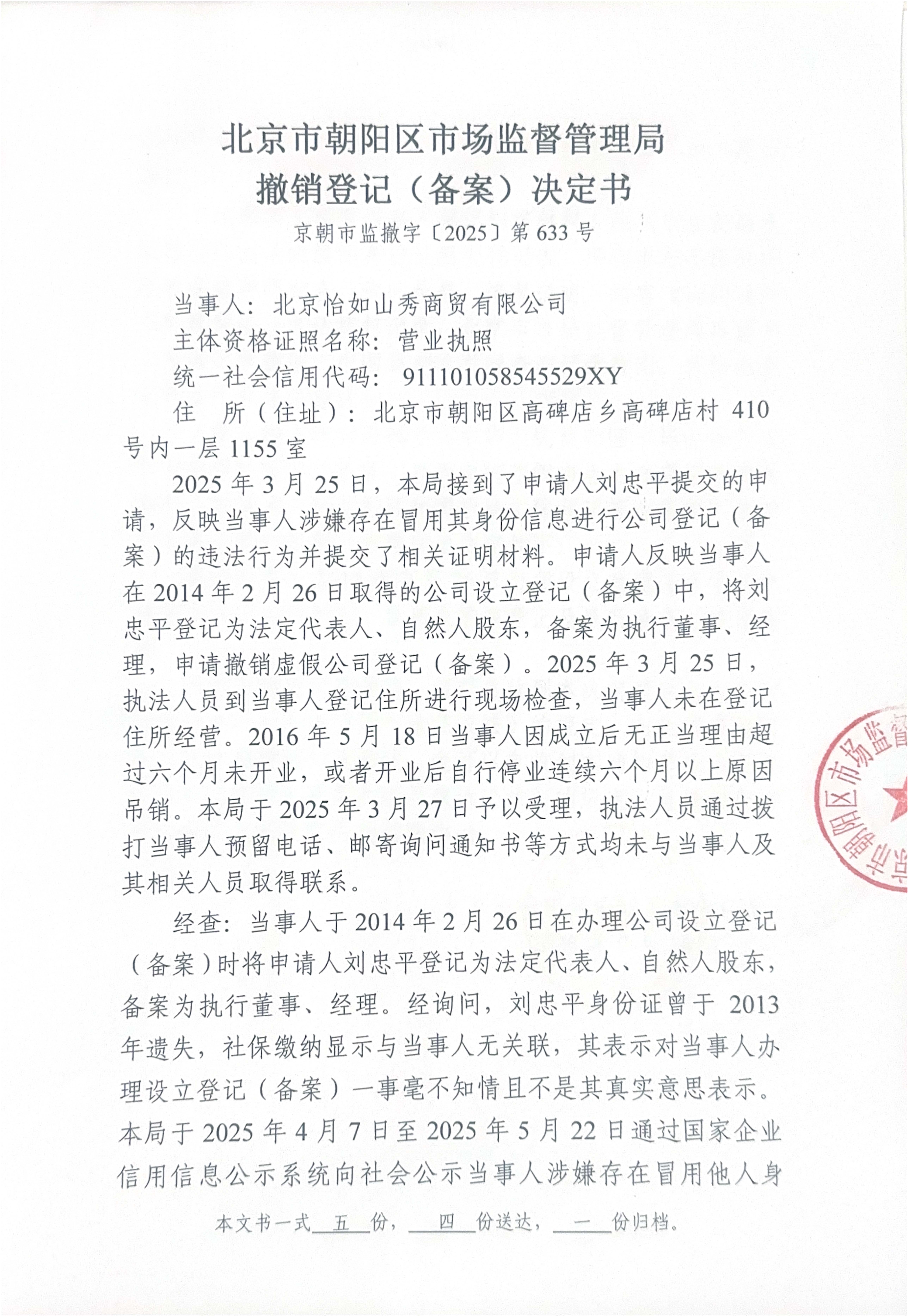 撤销北京怡如山秀商贸有限公司登记(备案)决定书