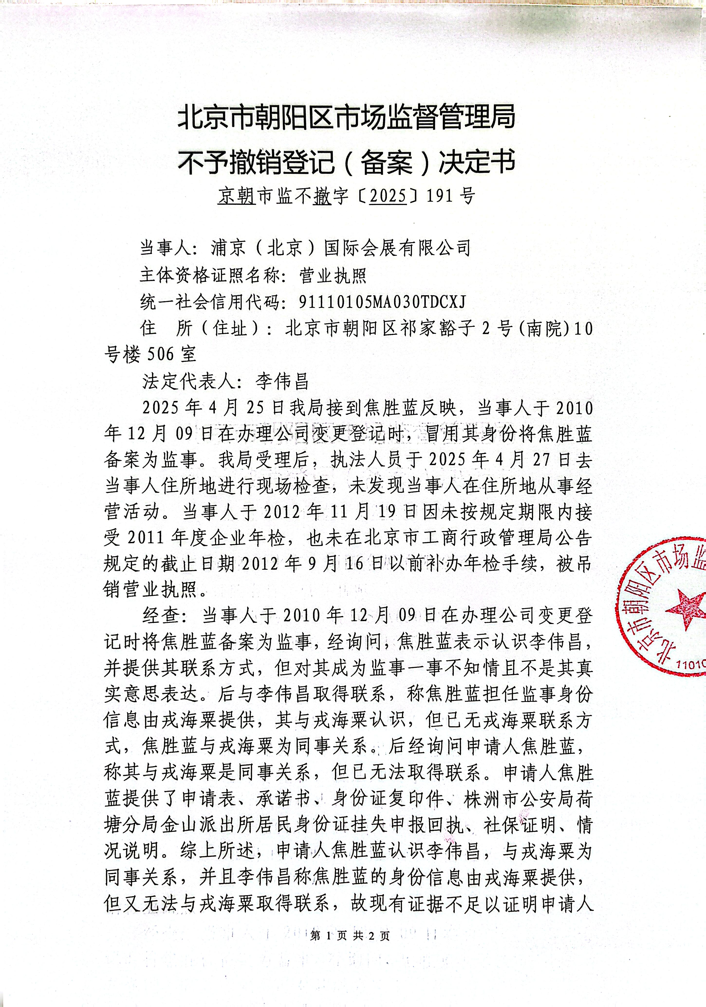 不予撤销浦京(北京)国际会展有限公司登记(备案)决定书