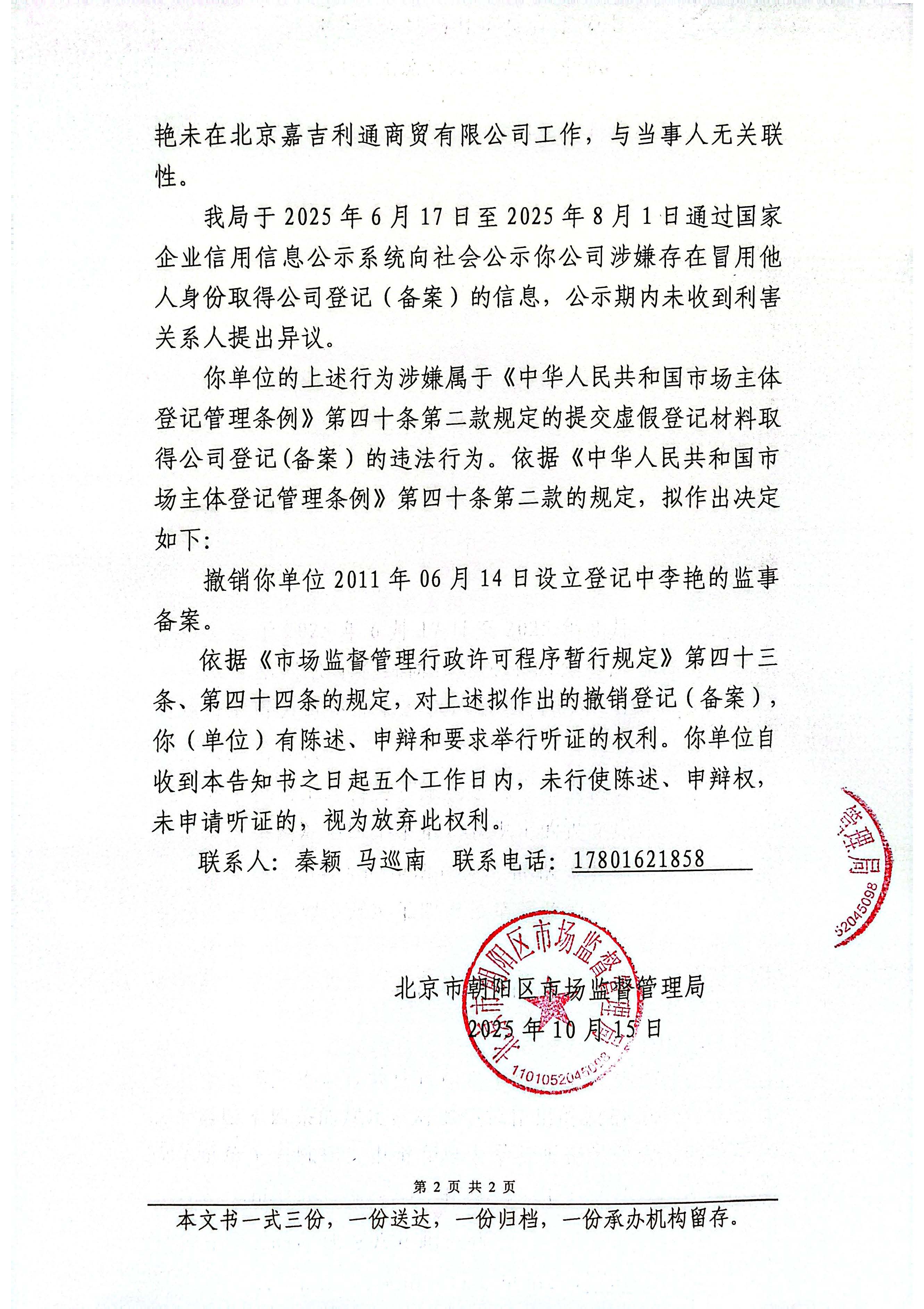 撤销北京嘉吉利通商贸有限公司登记(备案)告知书
