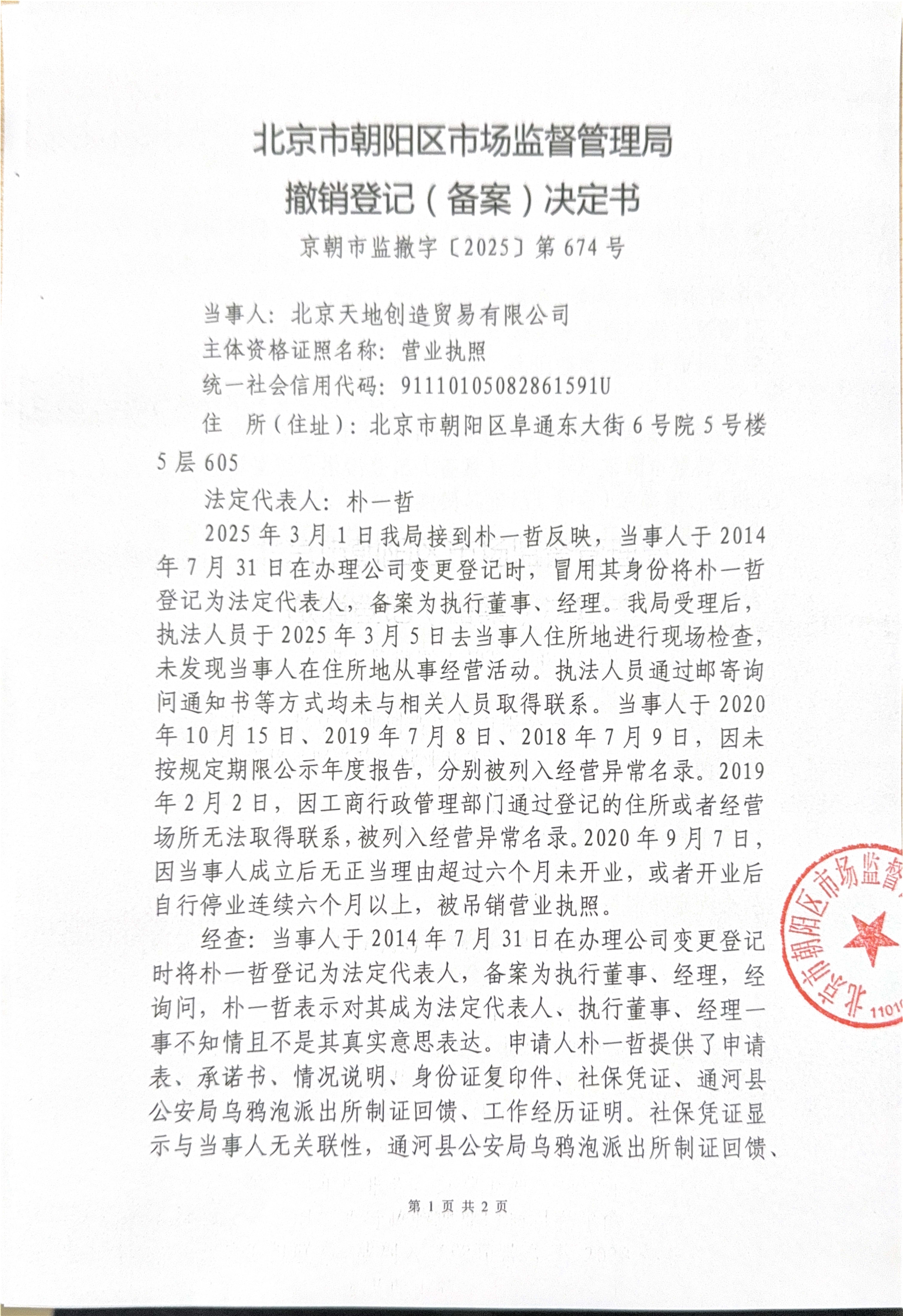 撤销北京天地创造贸易有限公司登记(备案)决定书