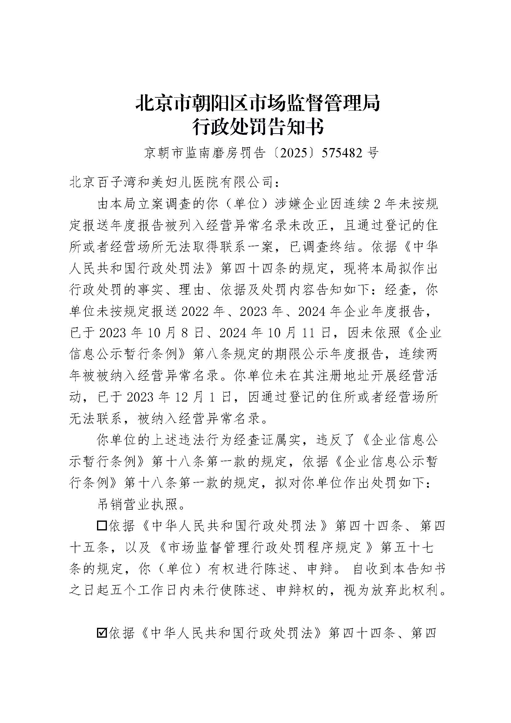北京百子湾和美妇儿医院有限公司行政处罚告知书
