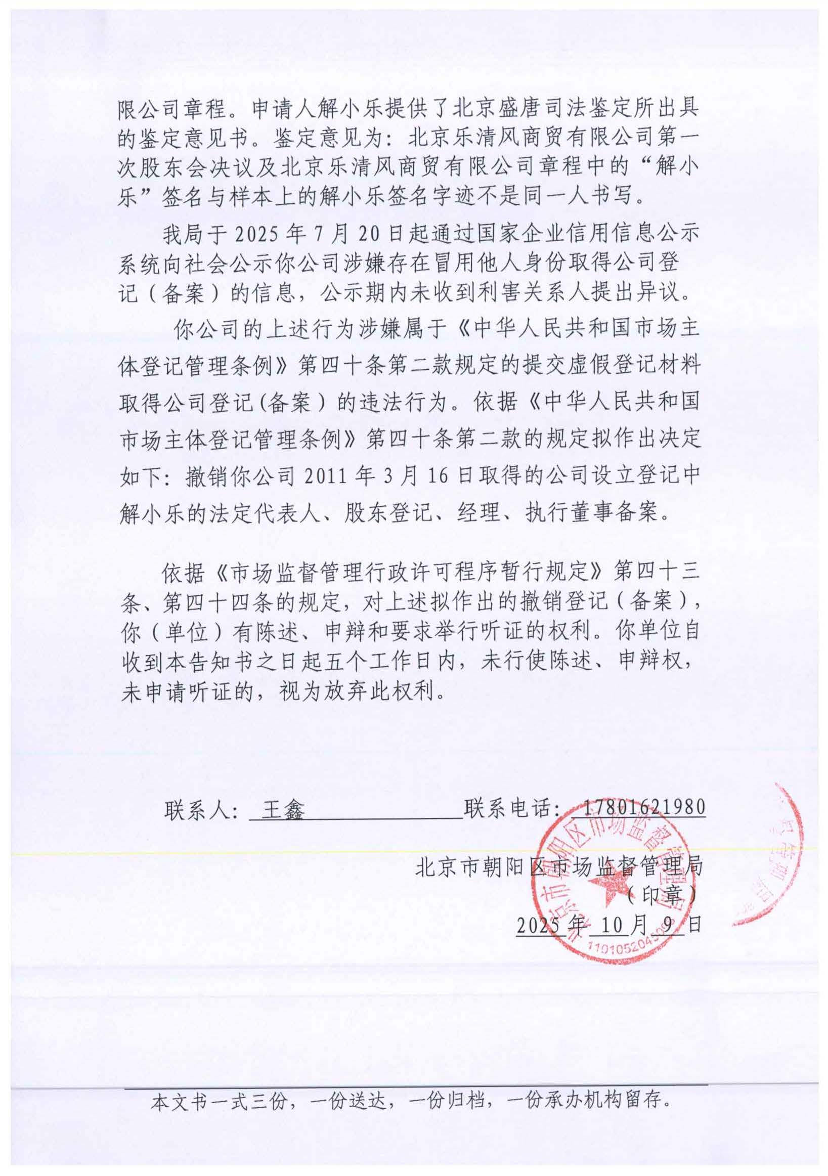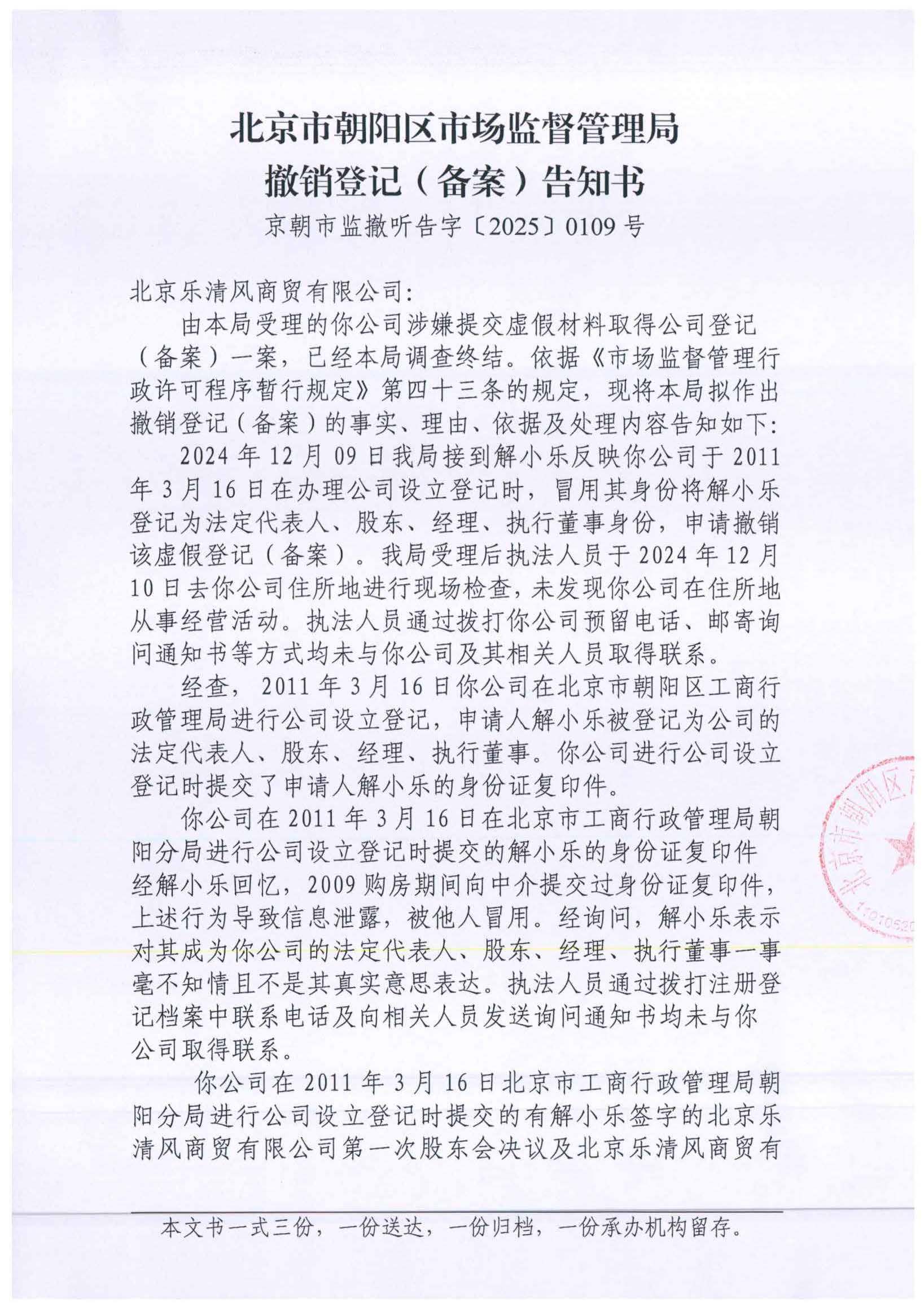 撤销北京乐清风商贸有限公司登记(备案)告知书