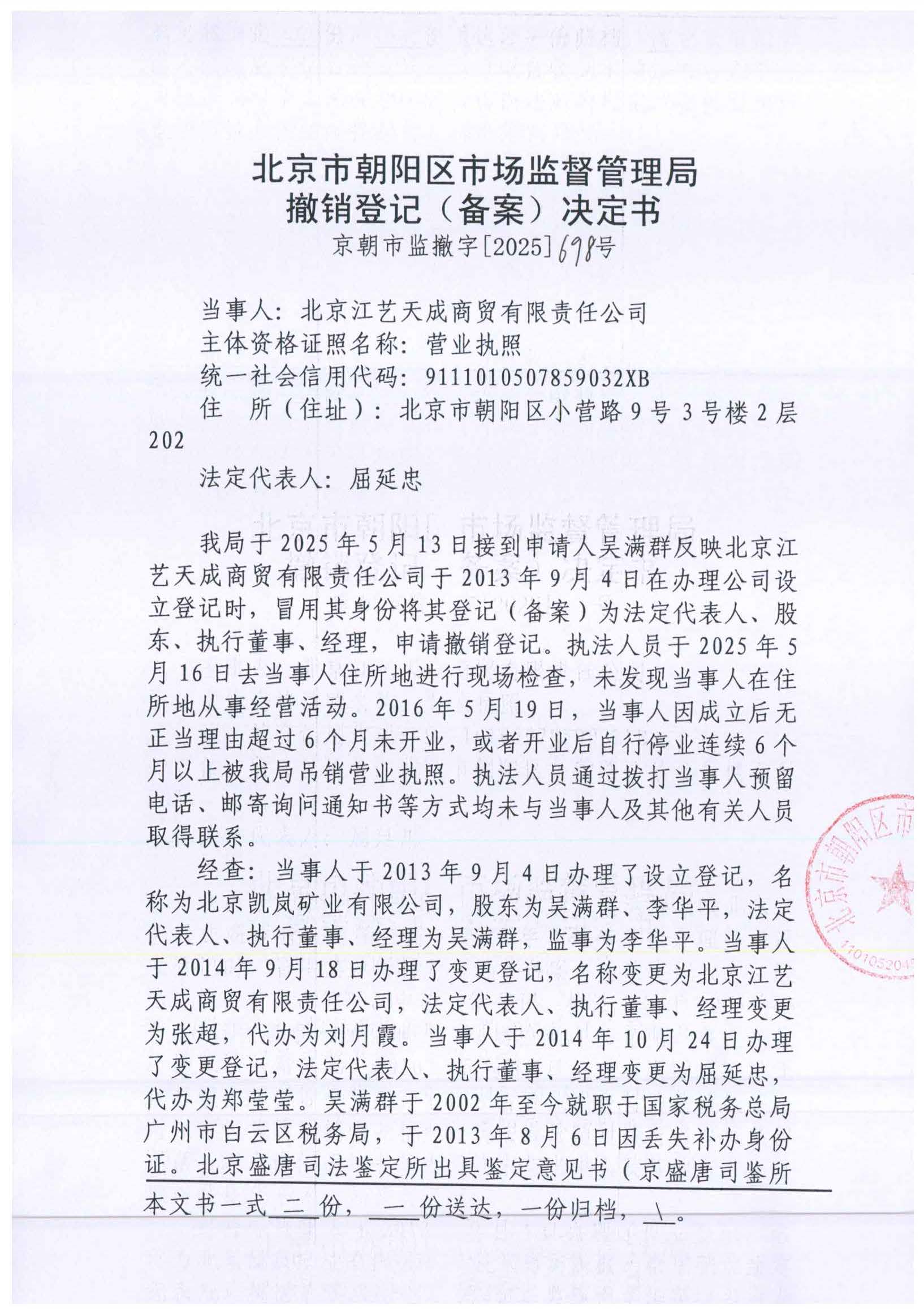 撤销北京江艺天成商贸有限责任公司登记(备案)决定书