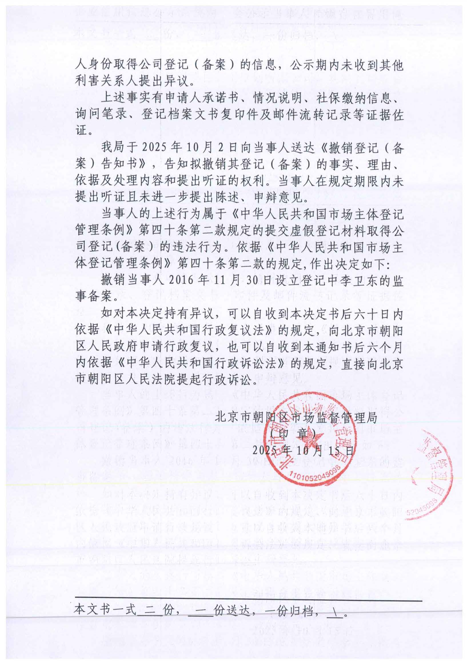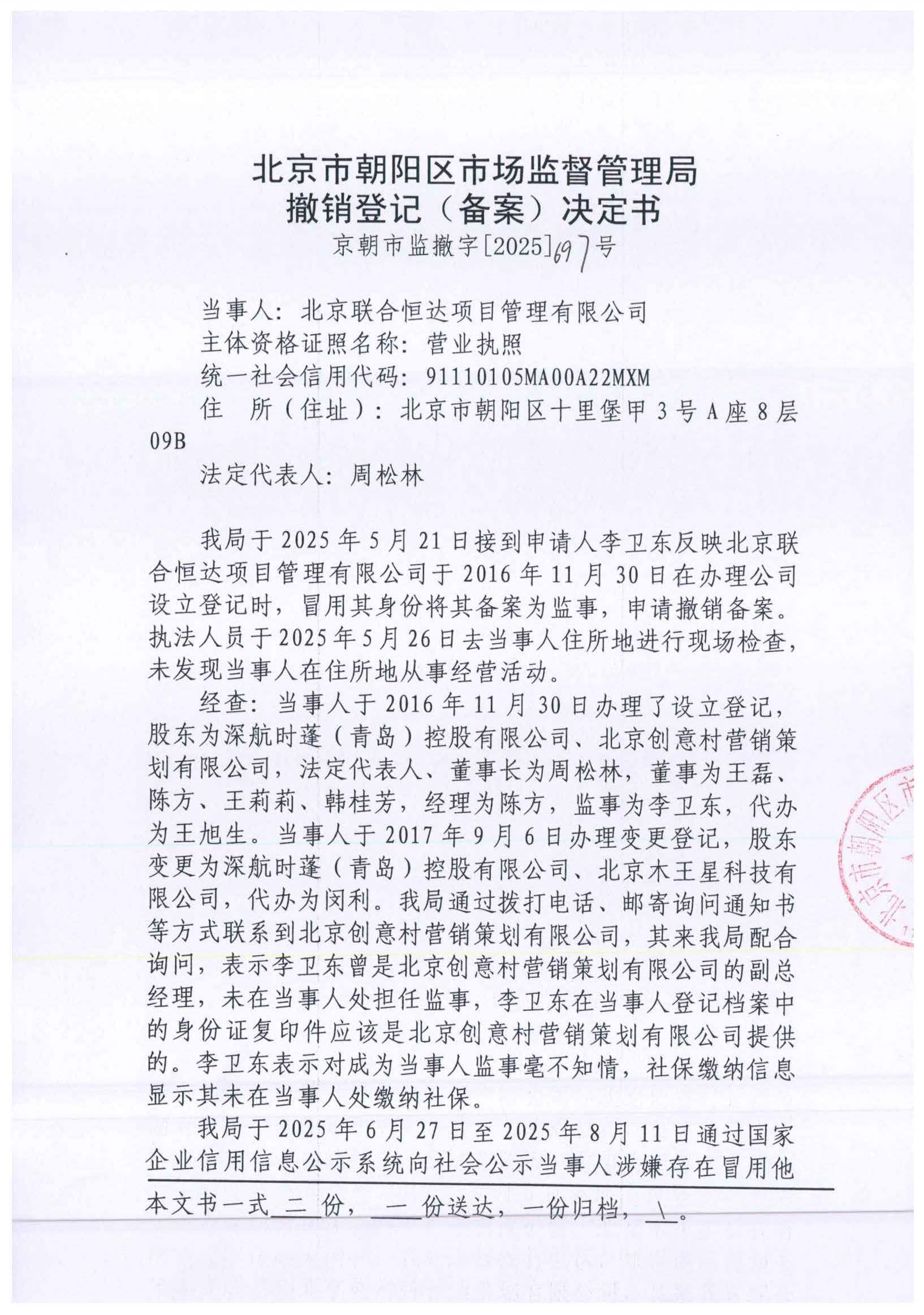 撤销北京联合恒达项目管理有限公司登记(备案)决定书