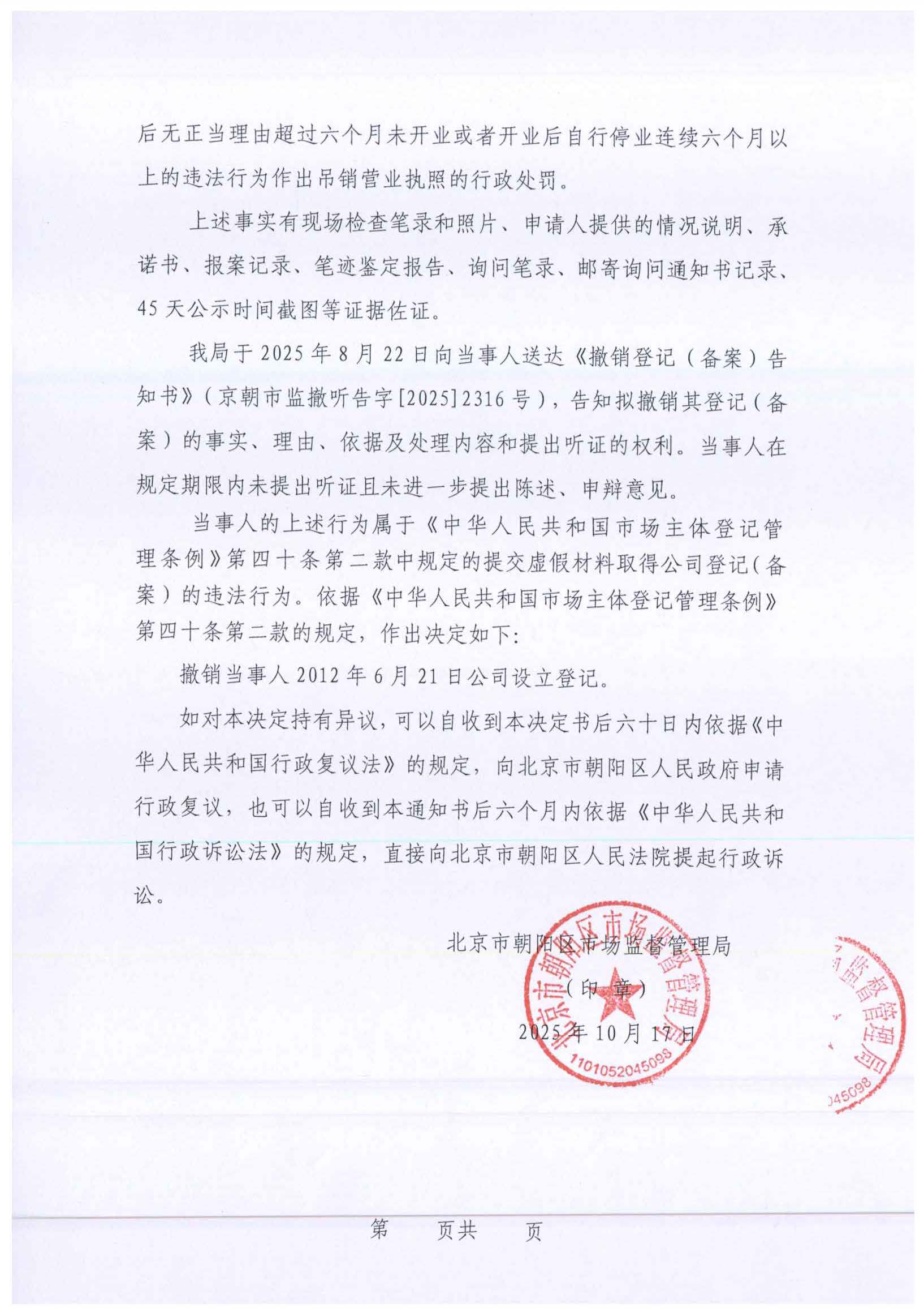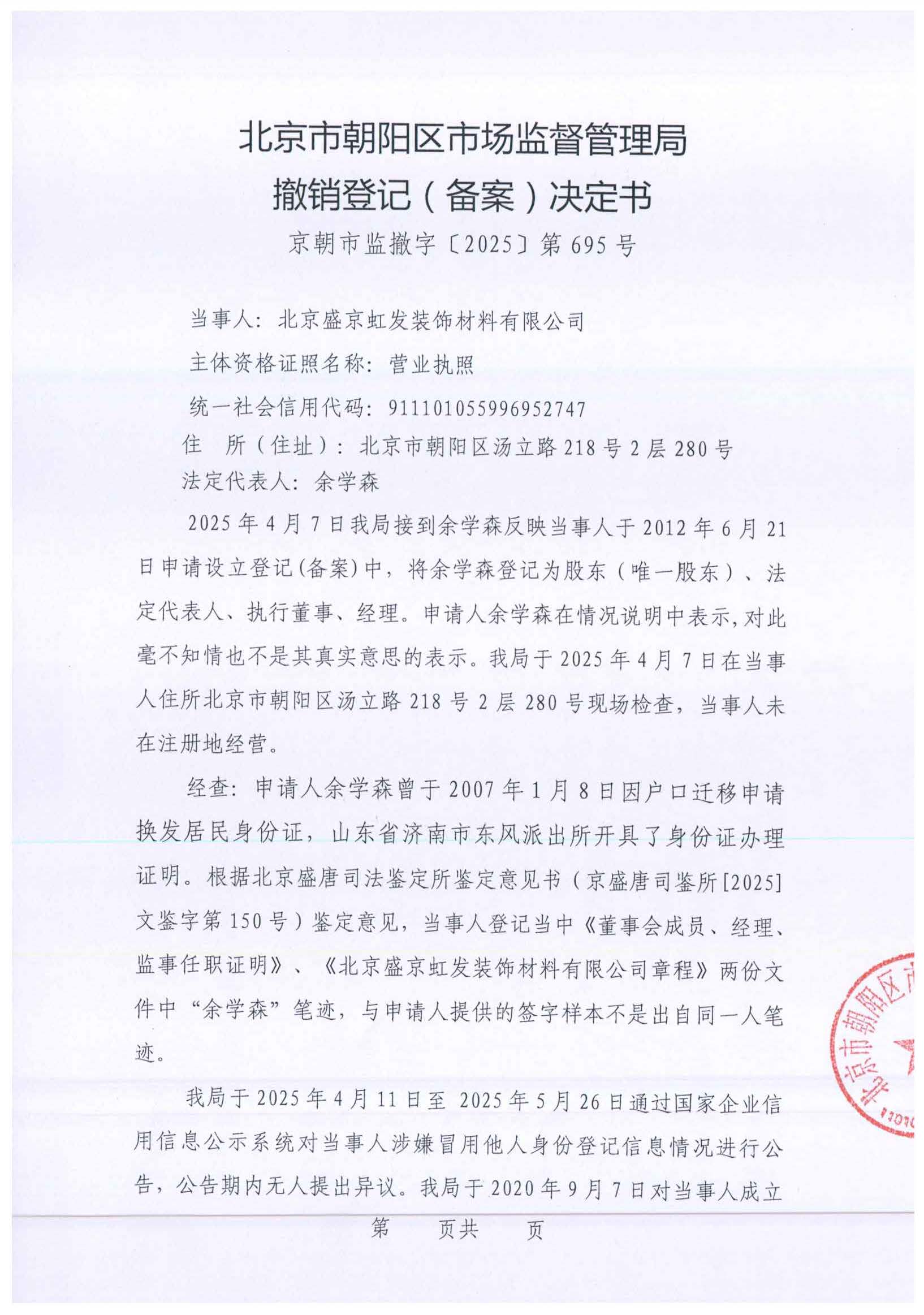 撤销北京盛京虹发装饰材料有限公司登记(备案)决定书