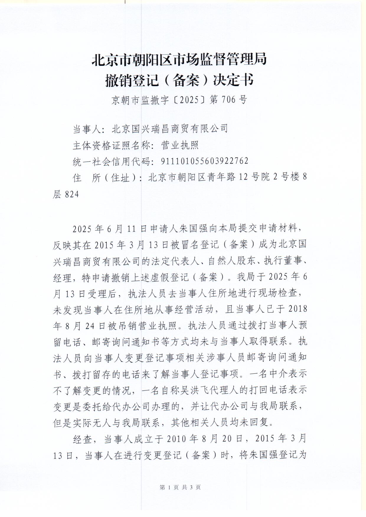 撤销北京国兴瑞昌商贸有限公司登记(备案)决定书