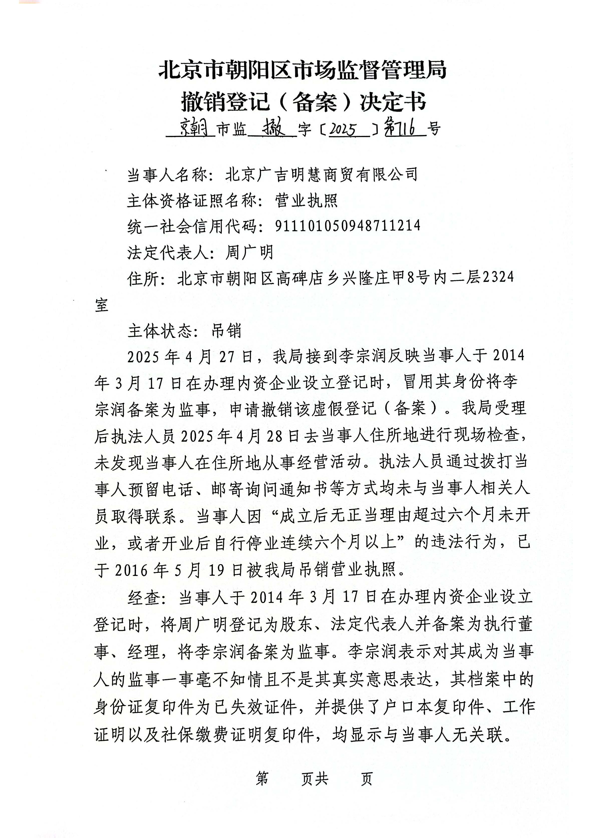 撤销北京广吉明慧商贸有限公司登记(备案)决定书