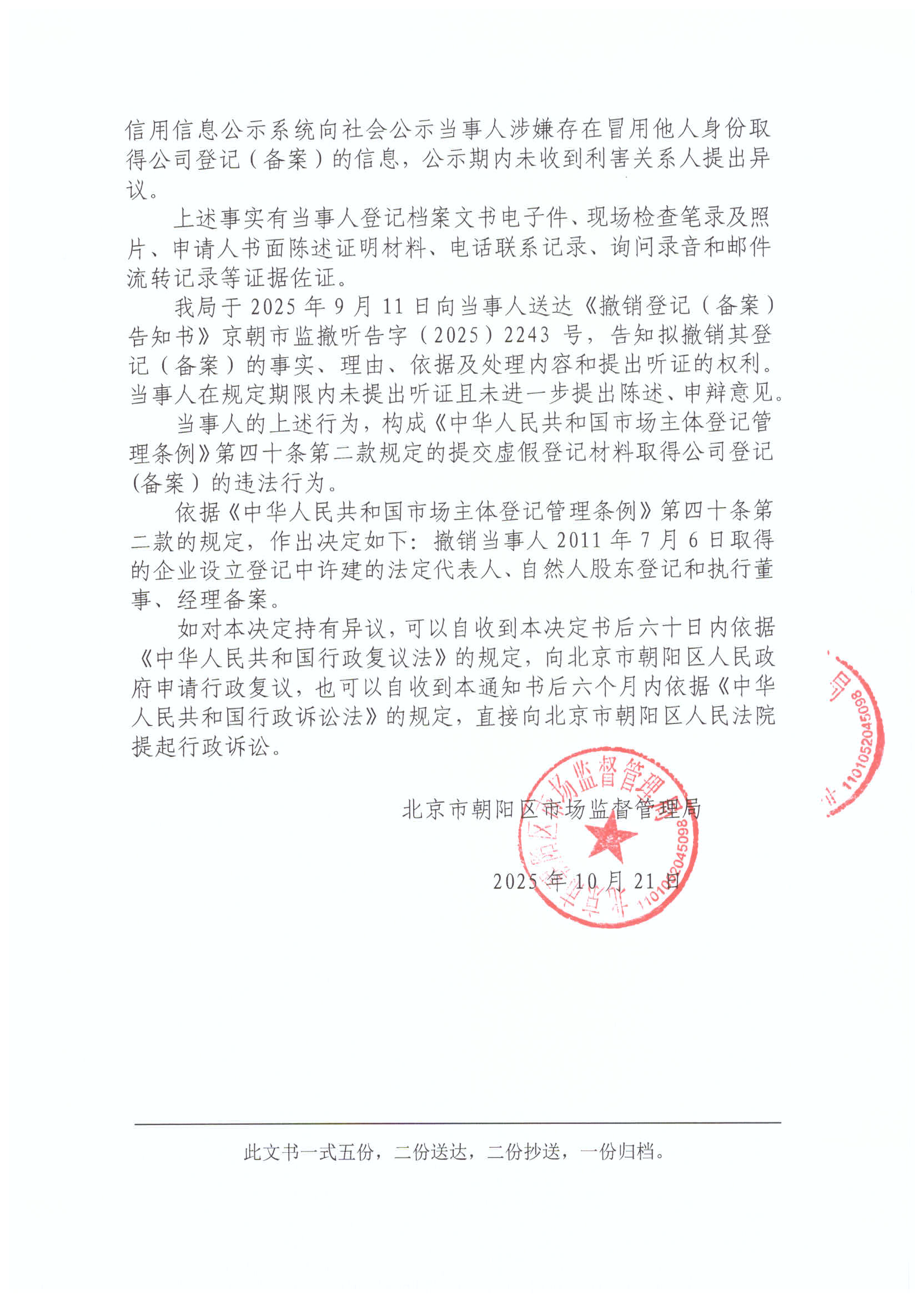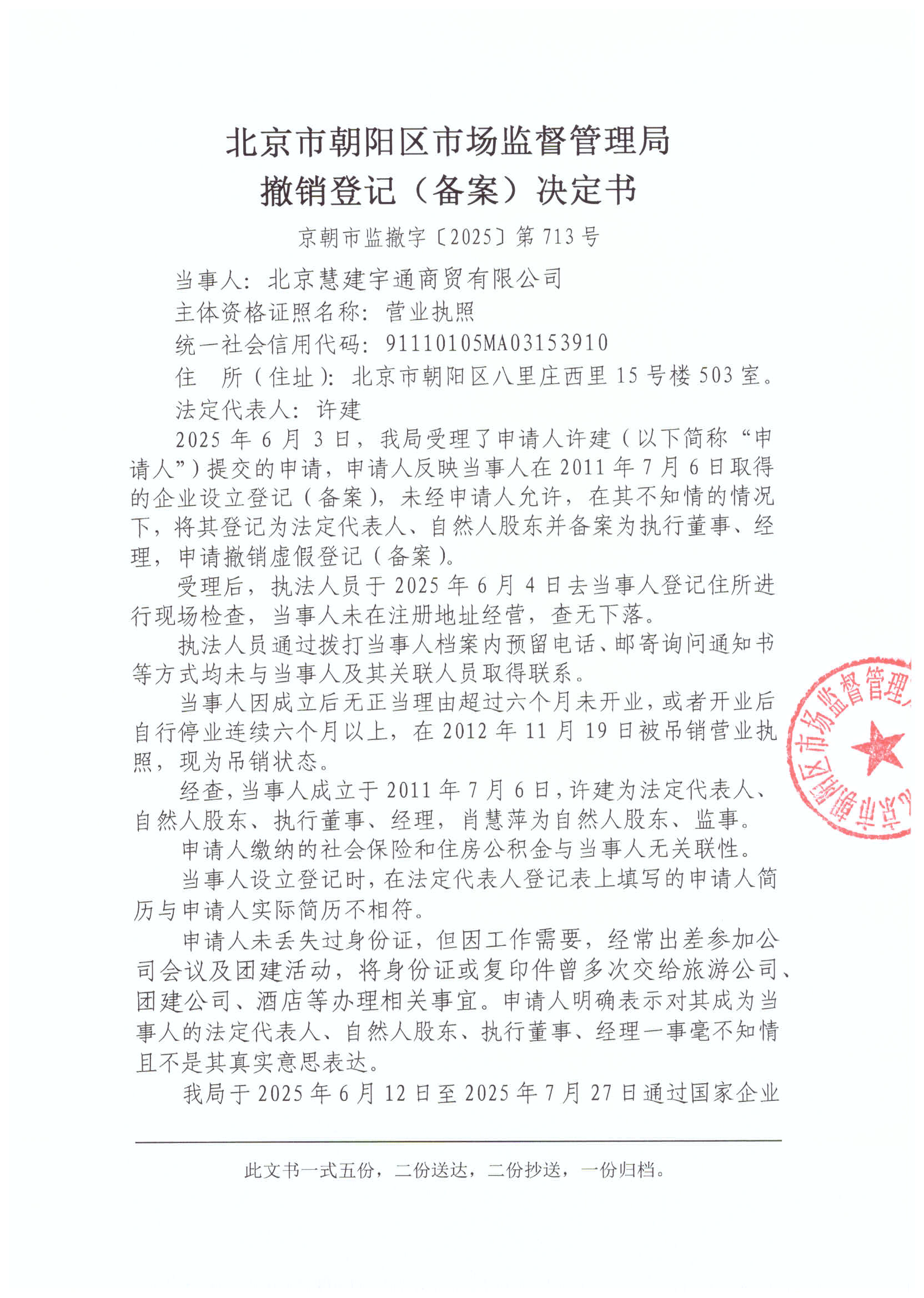撤销北京慧建宇通商贸有限公司登记(备案)决定书