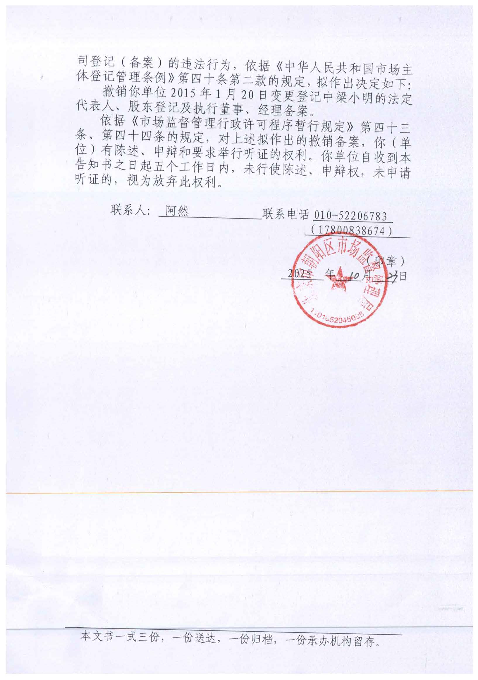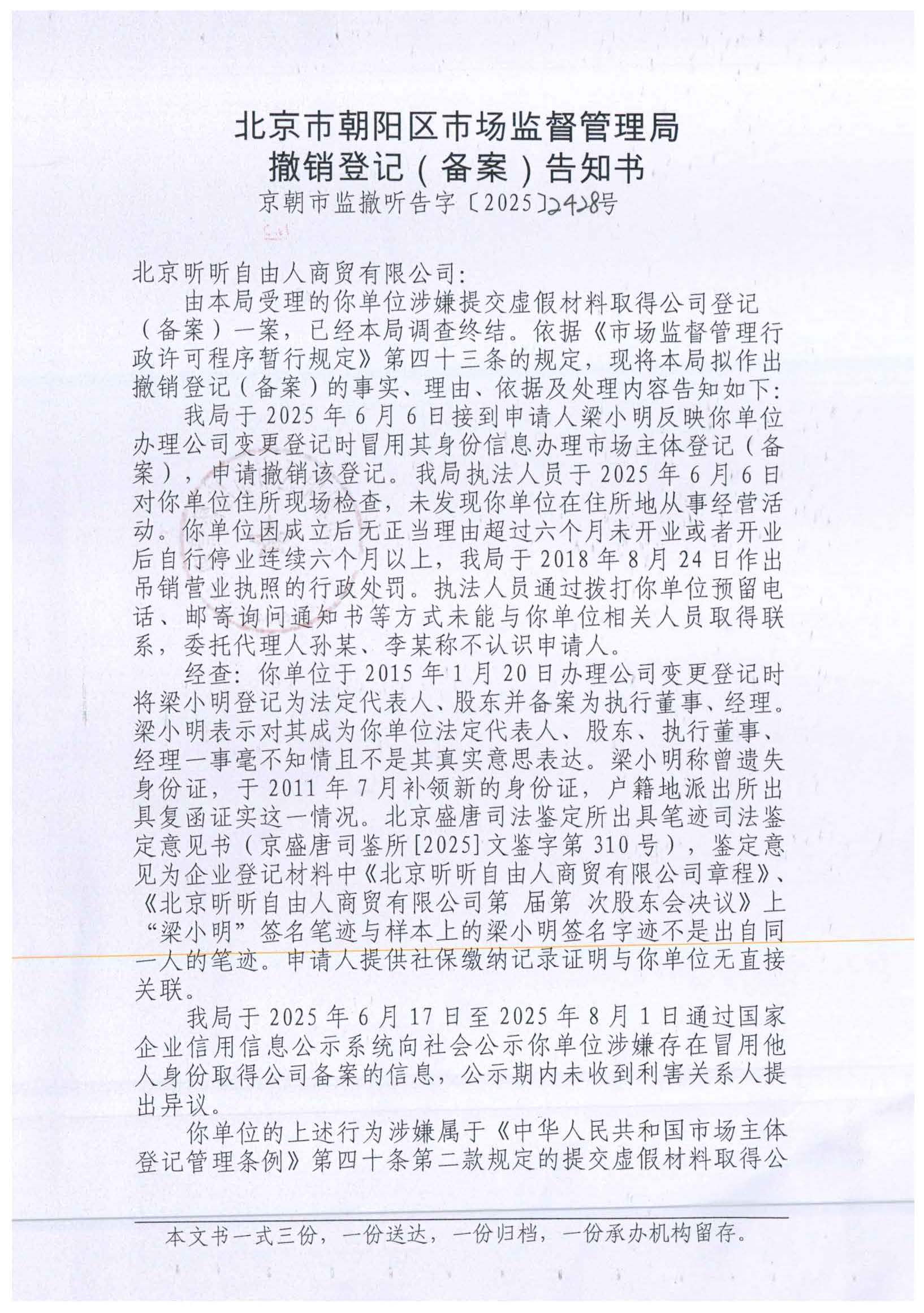 撤销北京昕昕自由人商贸有限公司登记(备案)告知书