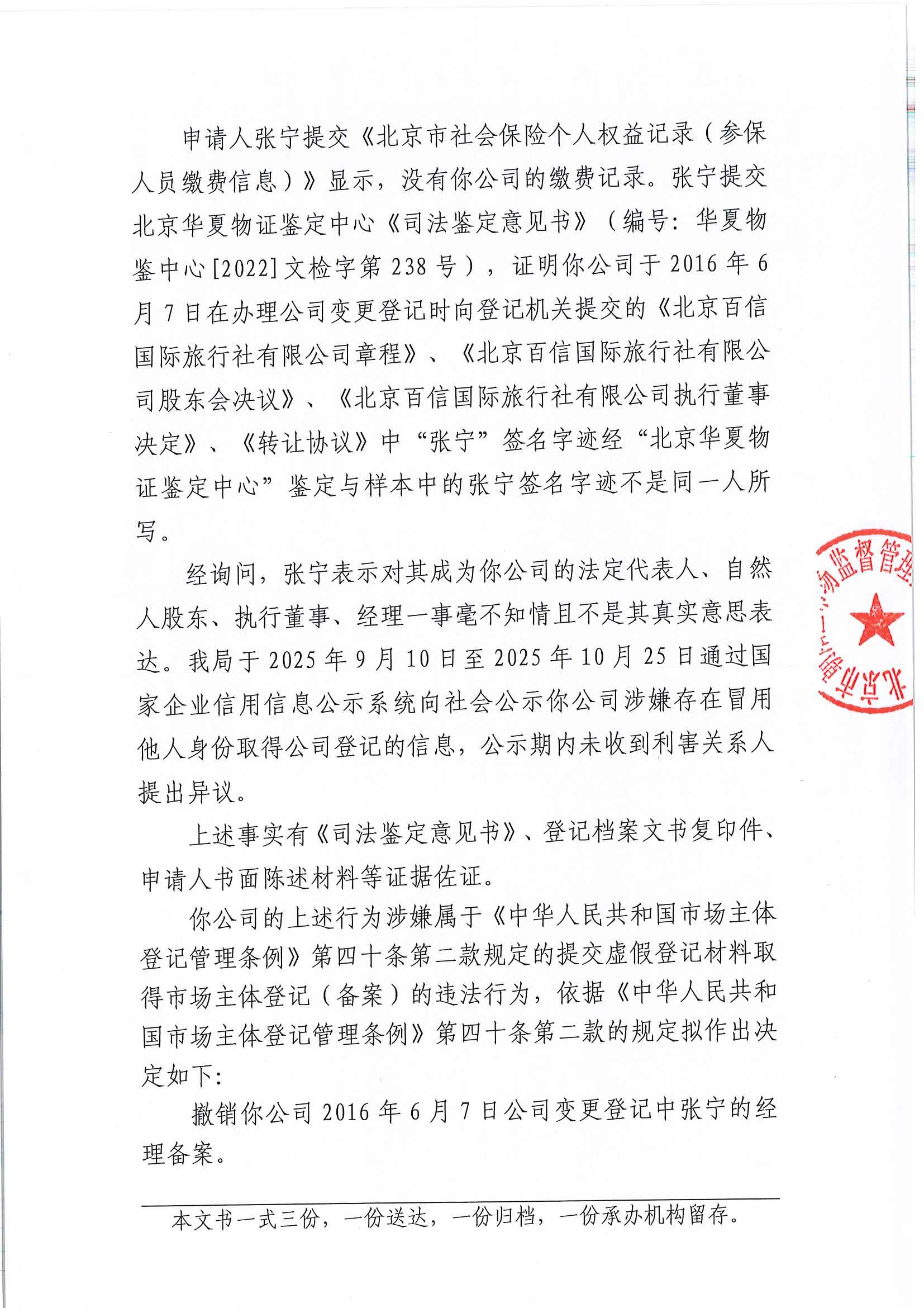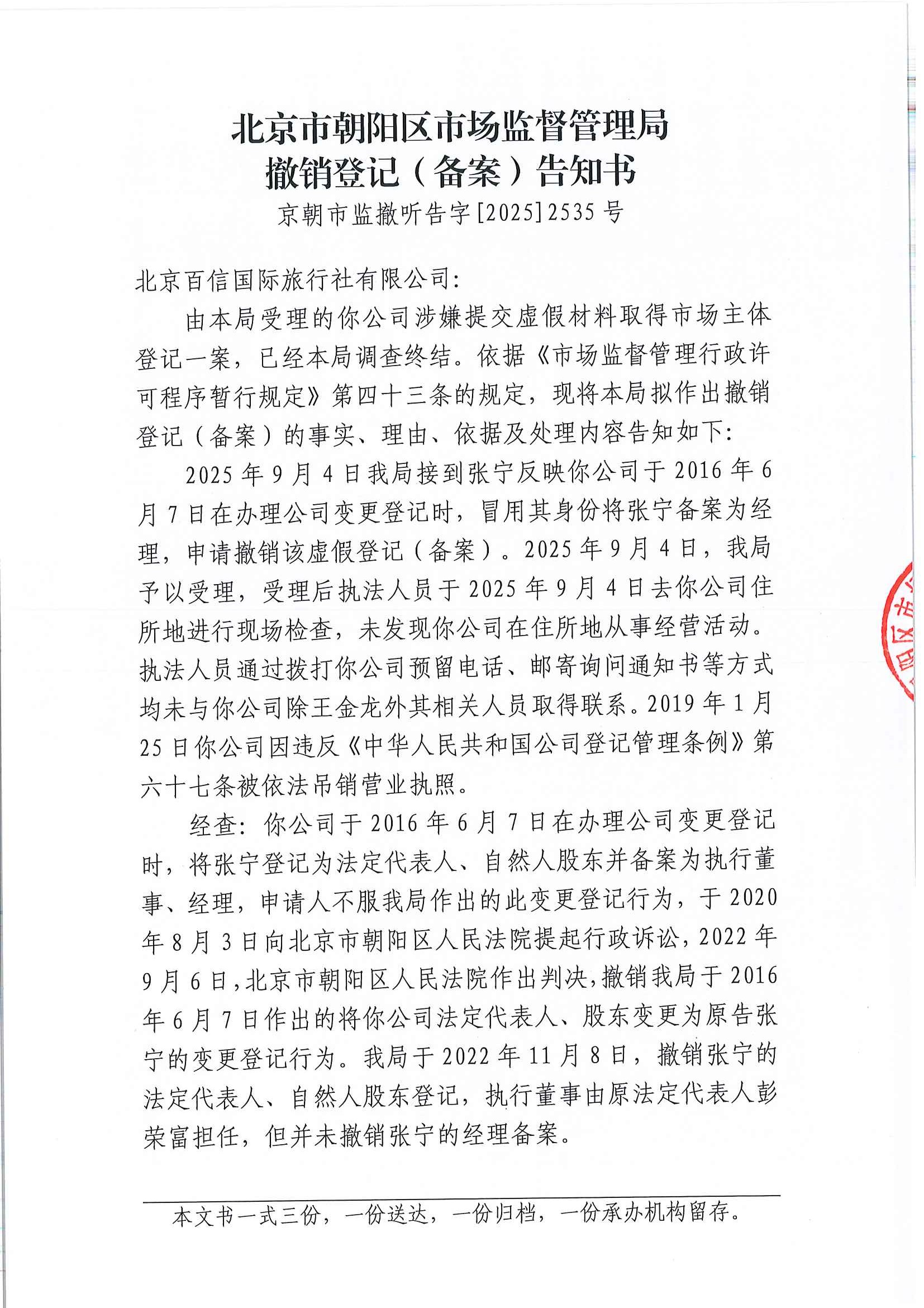 撤销北京百信国际旅行社有限公司登记(备案)告知书