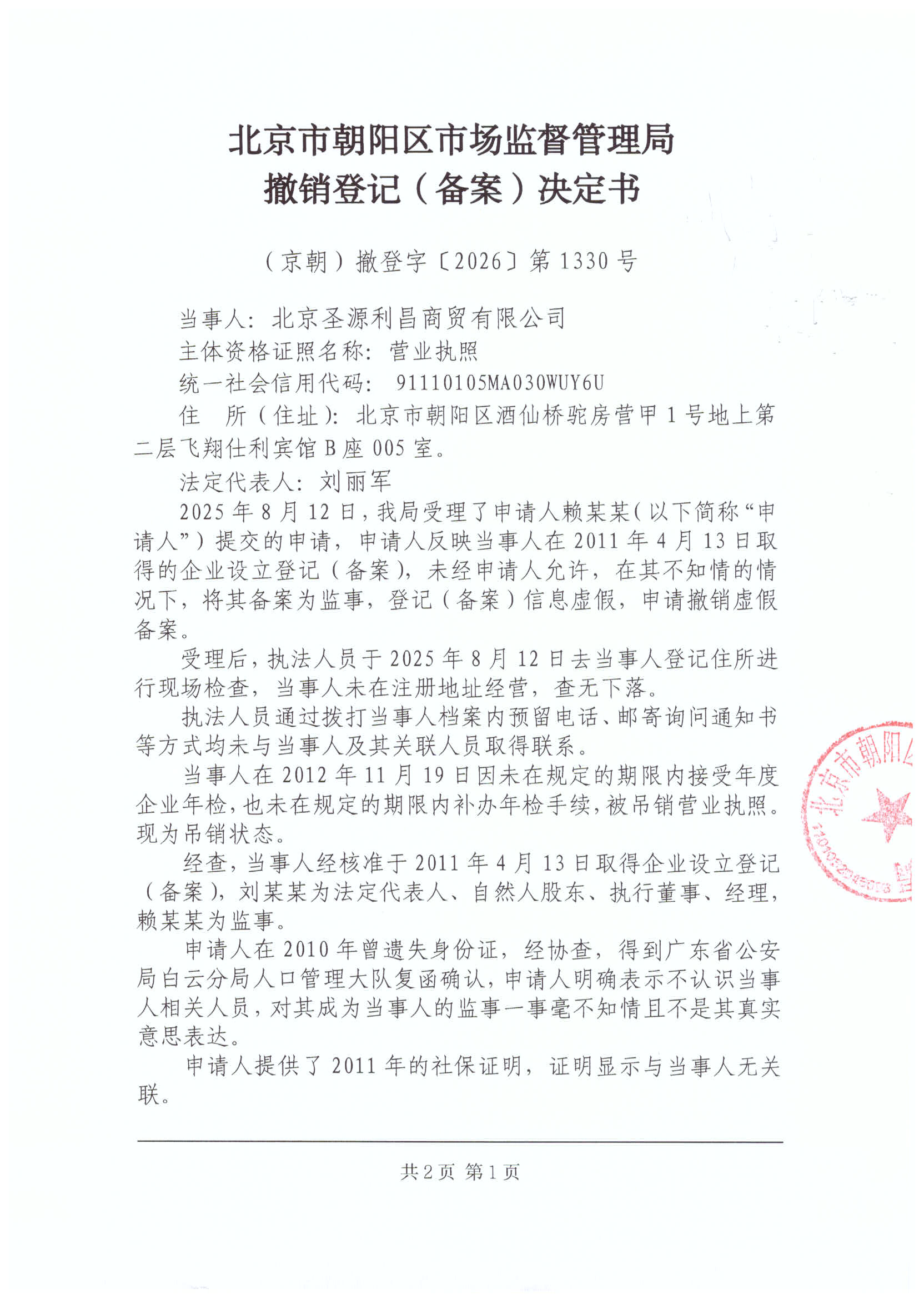 撤销北京圣源利昌商贸有限公司登记(备案)决定书